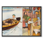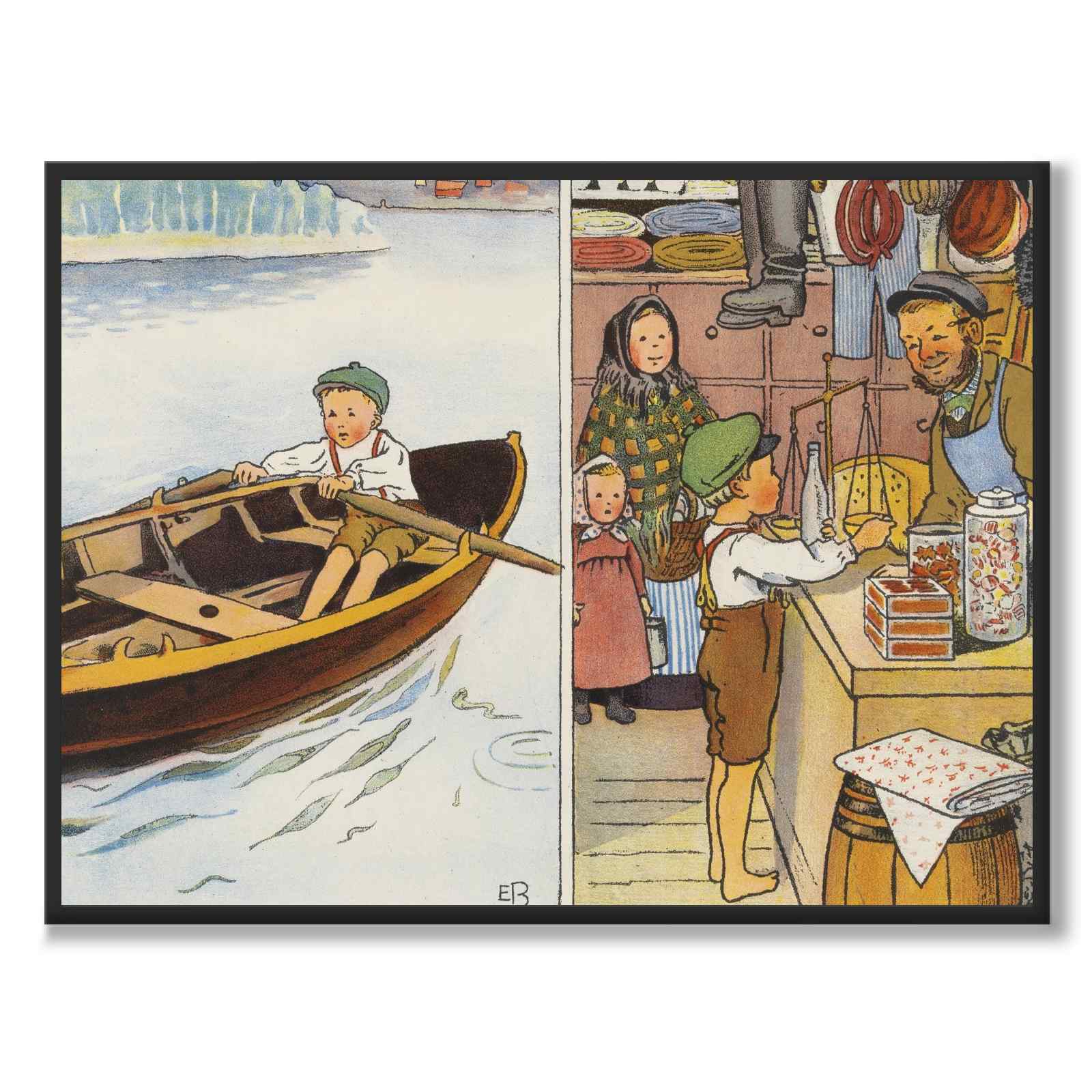 The picture shows two scenes from everyday life. On the left, a boy can be seen alone rowing a small boat over calm water. On the right, the same boy is standing in a country store, buying goods. The image depicts both responsibility and independence in a child's life.