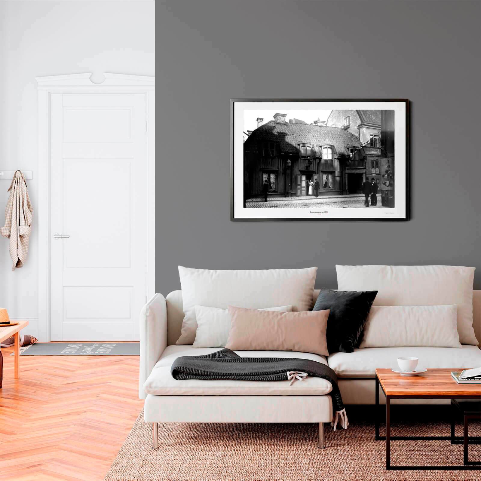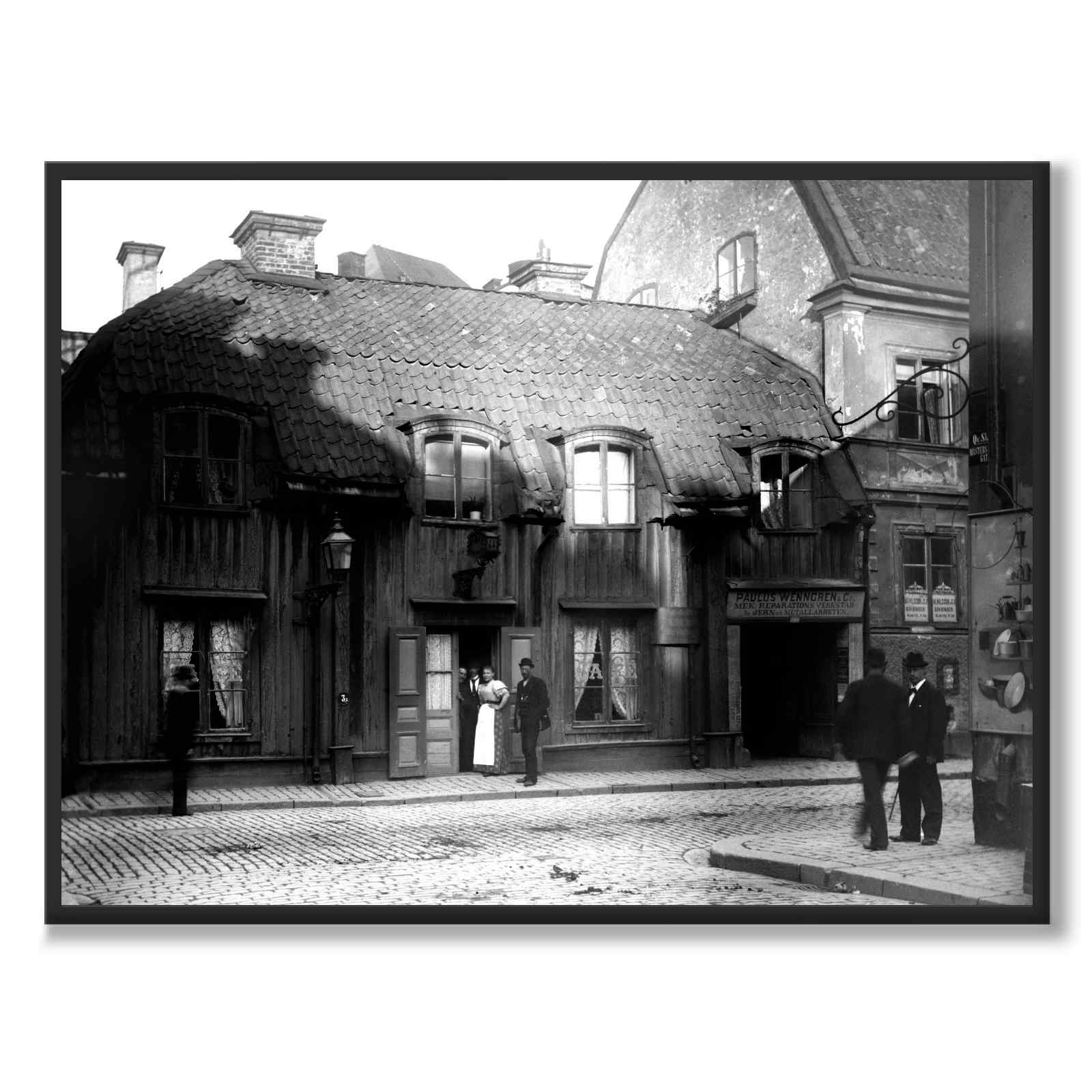 Foto fra 1895 som viser en gammel trebygning på Biblioteksgatan 8 i Stockholm. I dag er Biblioteksgatan en av Stockholms mest fasjonable shoppinggater hvor mange internasjonale merker har sine butikker. På nummer 8 ligger i dag restauranten Pas d'Art og en Burberry-butikk.