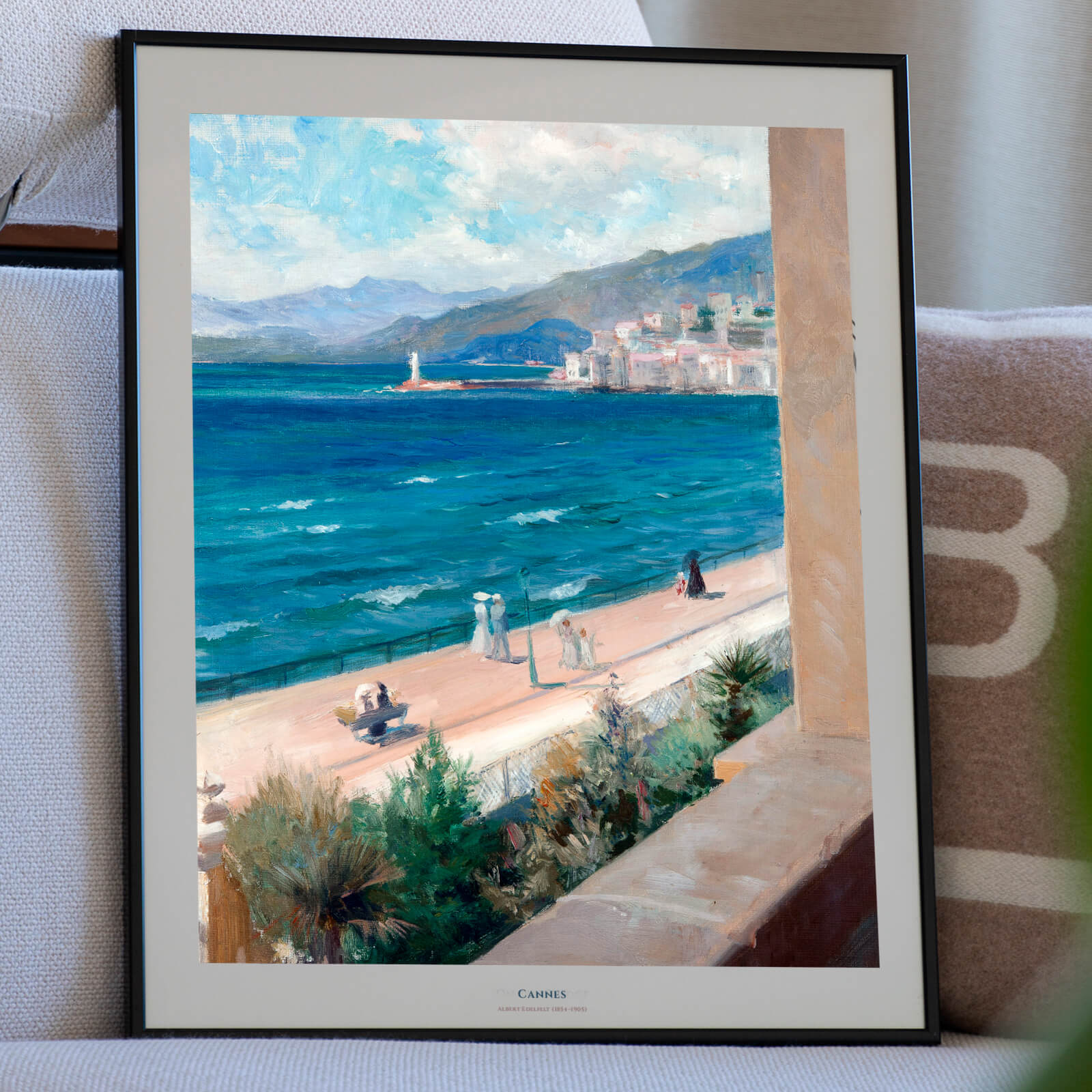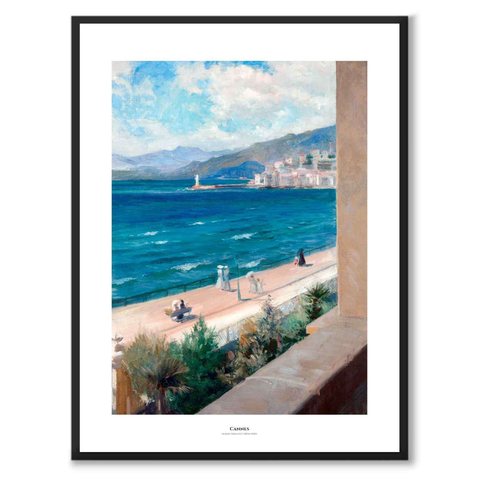 Plakat med det vakre maleriet Fra mitt vindu i Cannes av Albert Edelfelt. På bildet ser vi folk i tidstypiske klær som går langs La Croisette-promenaden.