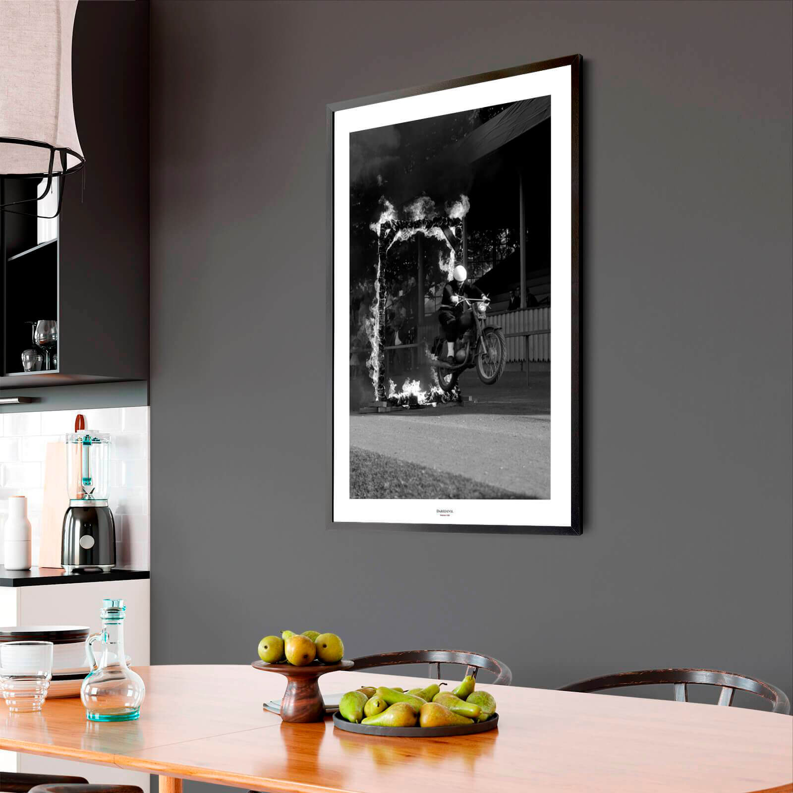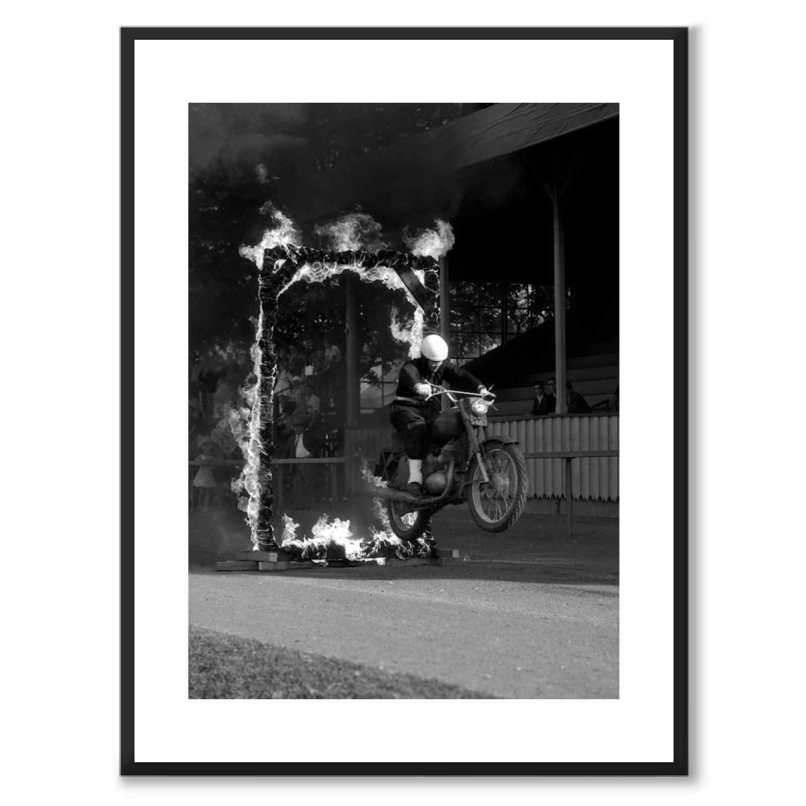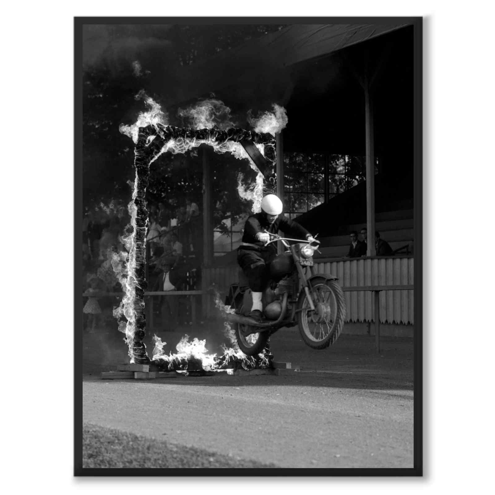 En politimann kjører gjennom brann på motorsykkel i 1960. I bakgrunnen står tilskuere og ser på.