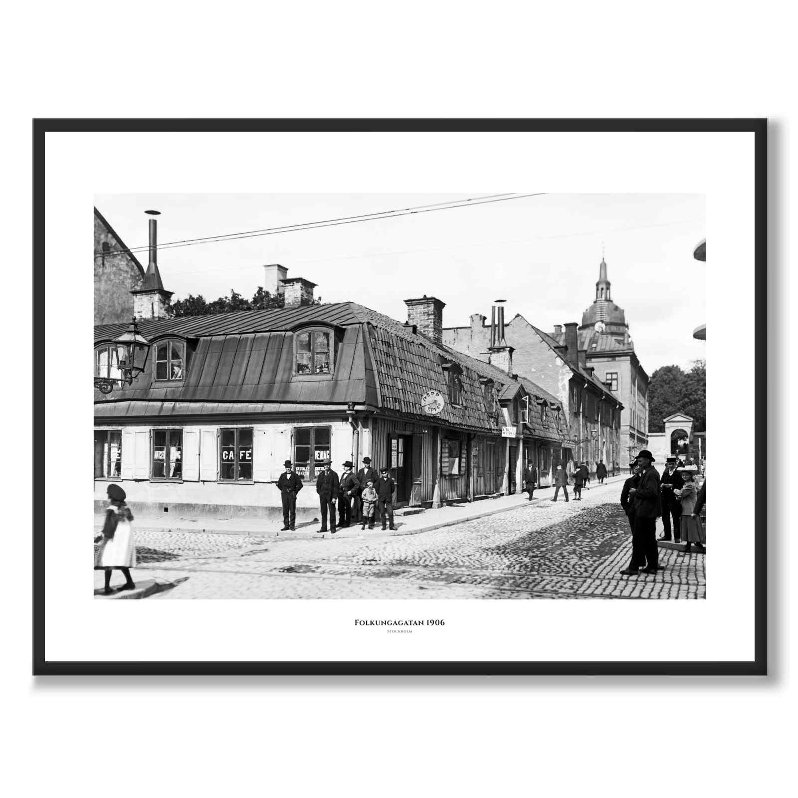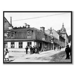 Et gammelt bilde av Södermannagatan 6 på Södermalm, nord fra Folkungagatan mot Katarina kirke. Året er 1906 og på bildet ser vi menn, kvinner og barn som er ute og går i byen i tidstypiske klær.