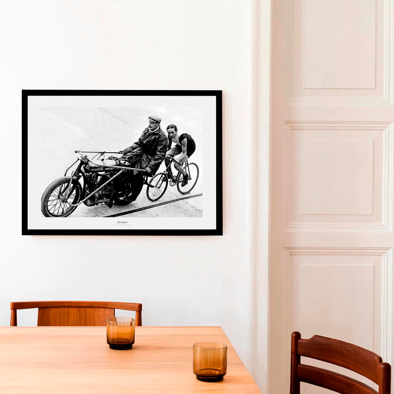En motorsyklist fungerer som rytter for elitesyklisten Andrew Hansson, som er tett bak. Bildet er tatt i 1908 ved en dansk velodrom. En velodrom er en oval og skråstilt bane for konkurransesyklister og hastigheten kunne komme opp i 110 km/t, noe som selvfølgelig var risikabelt, spesielt siden verken motorsyklisten eller syklisten hadde noen beskyttelse.