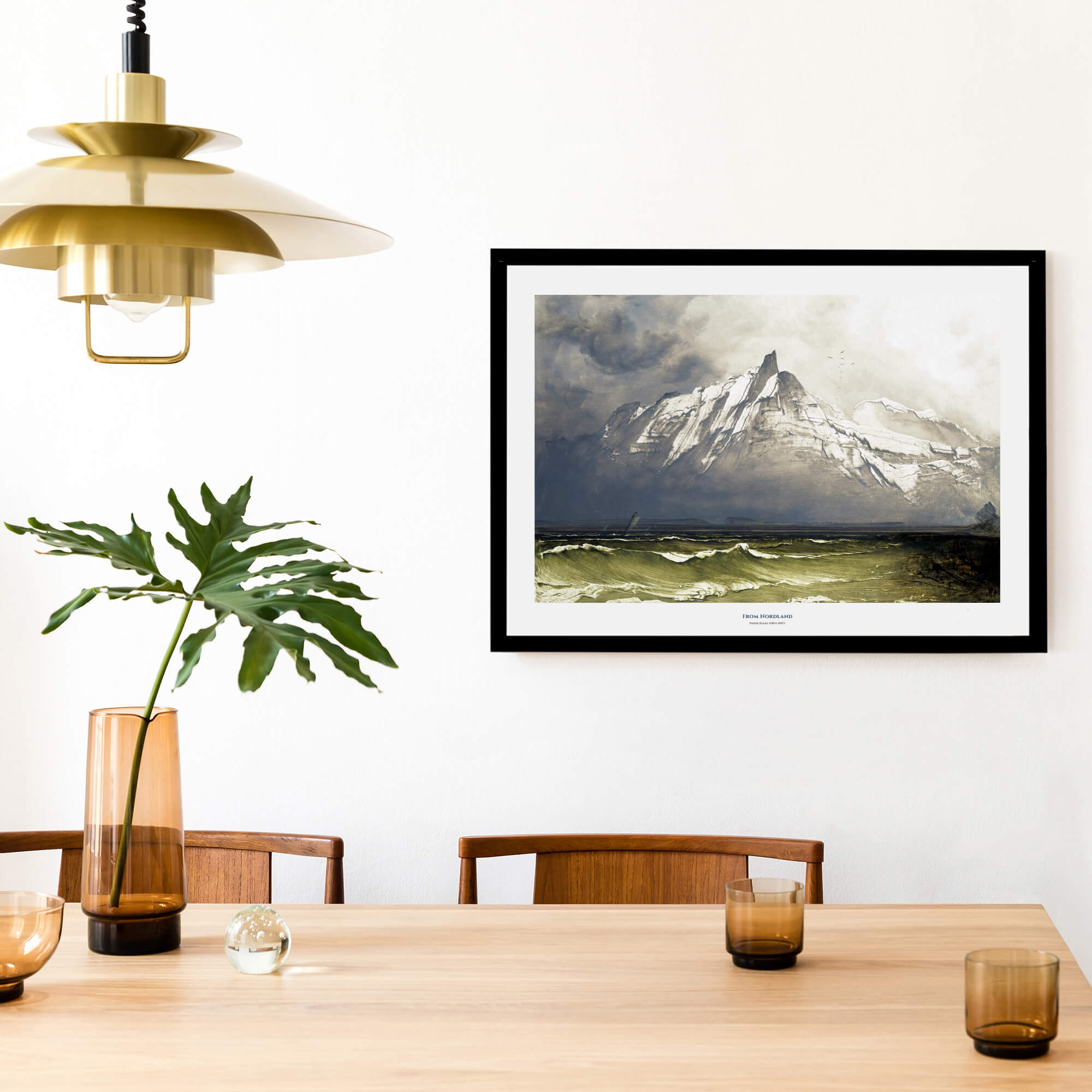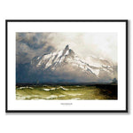 Plakat med maleri fra 1800-tallet av den norske landskapsmaleren Peder Balke. Motivet viser et mektig landskap med norske fjell i Nordland og et stormfullt hav.