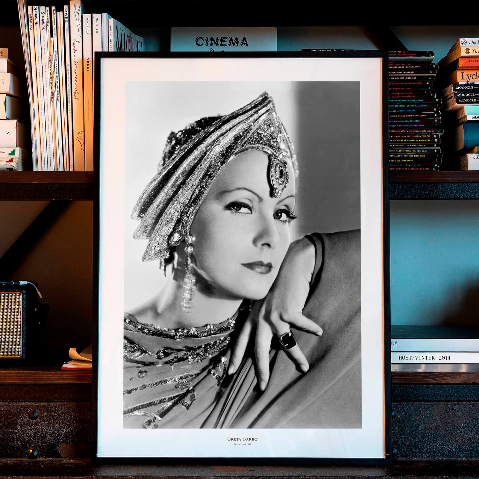 Plakat med et fotografi av ingen ringere enn den ikoniske svenske skuespillerinnen Greta Garbo i romantikk- og dramafilmen Mata Hari fra 1931. Greta Garbo spilte hovedrollen, en svært forførende spion under første verdenskrig.