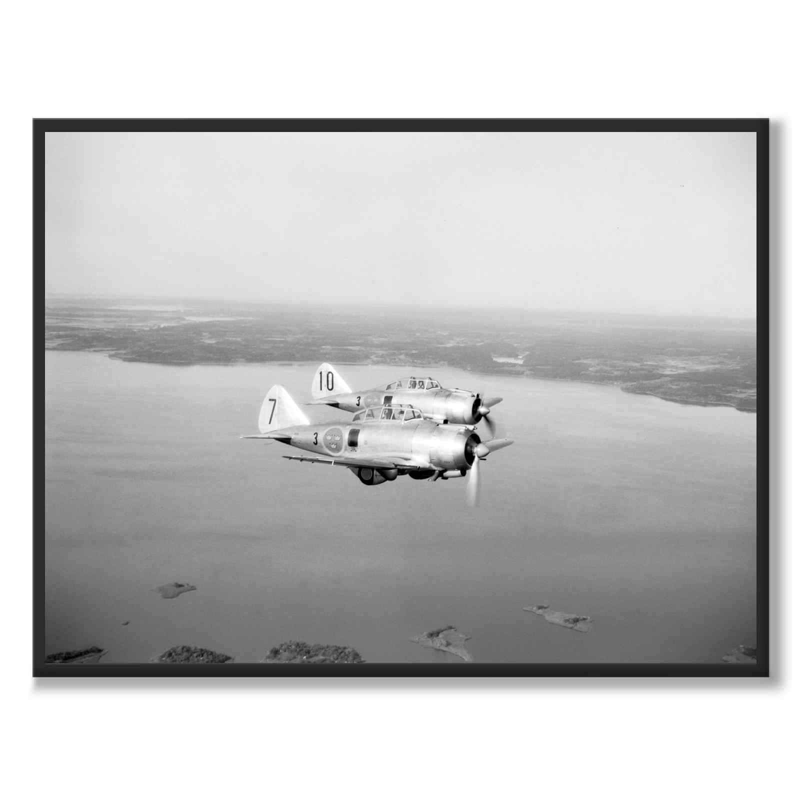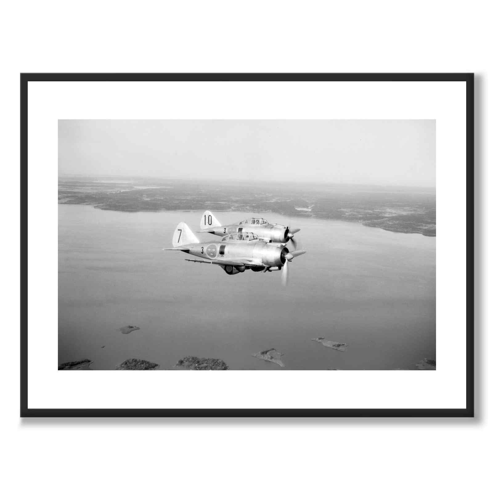 To J9-jagerfly fra F3 Malmen flyr i rote over Roxensjøen i 1948. J9-jagerflyet ble brukt som spaningsfly av flotiljene F3 og F11 på denne tiden. Lake Roxen ligger mellom Linköping og Norrköping.