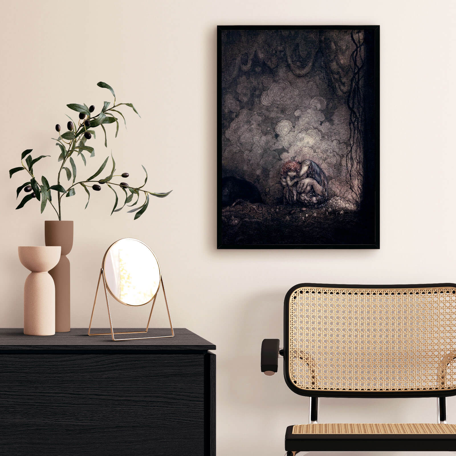 Plakat med maleriet Mother's Love av John Bauer fra 1917. Småbarnet Humpe sitter omfavnet av sin mor i den dype skogen. Heksemor ser på ungen sin med dyp kjærlighet og glede i øynene mens hun synger ham i søvn.