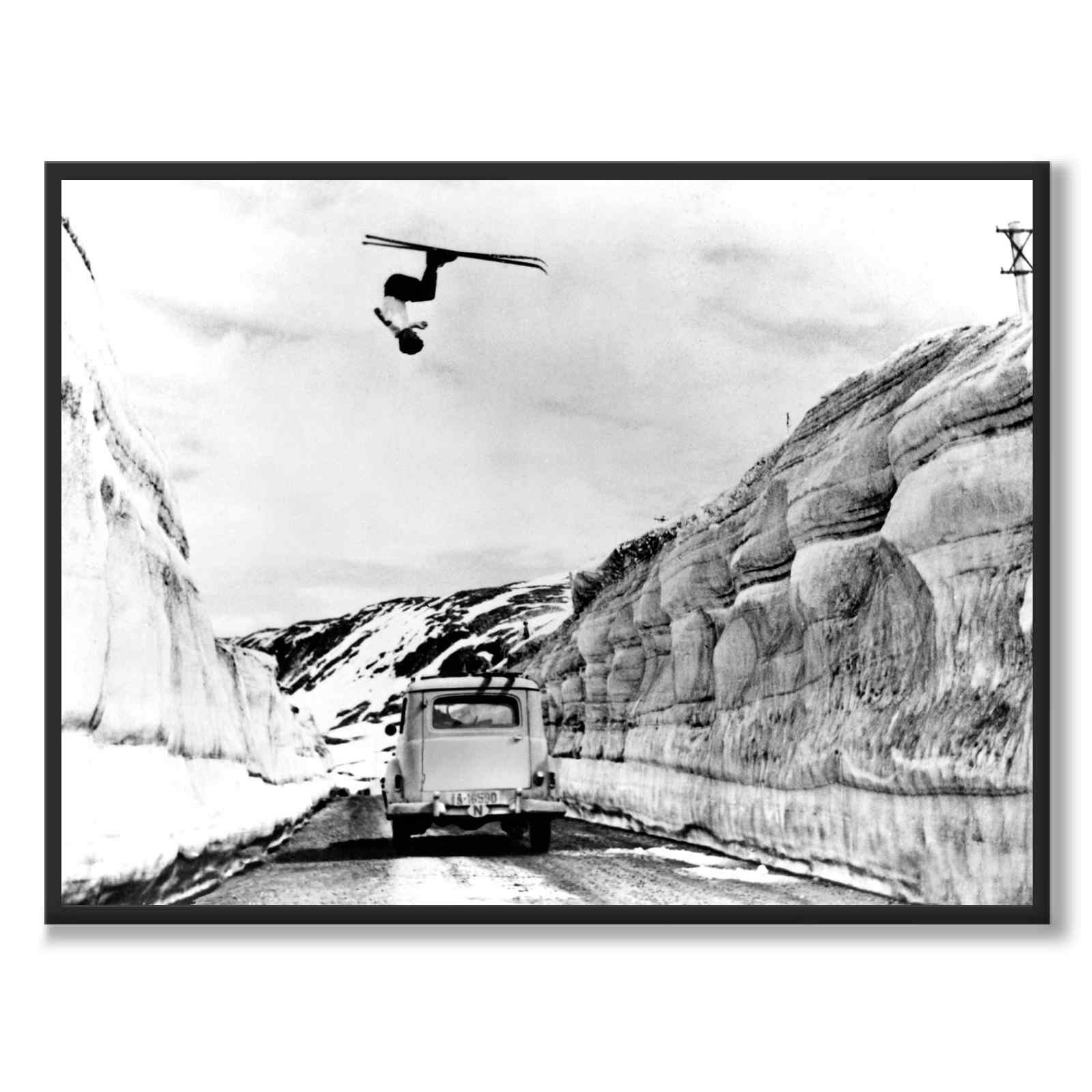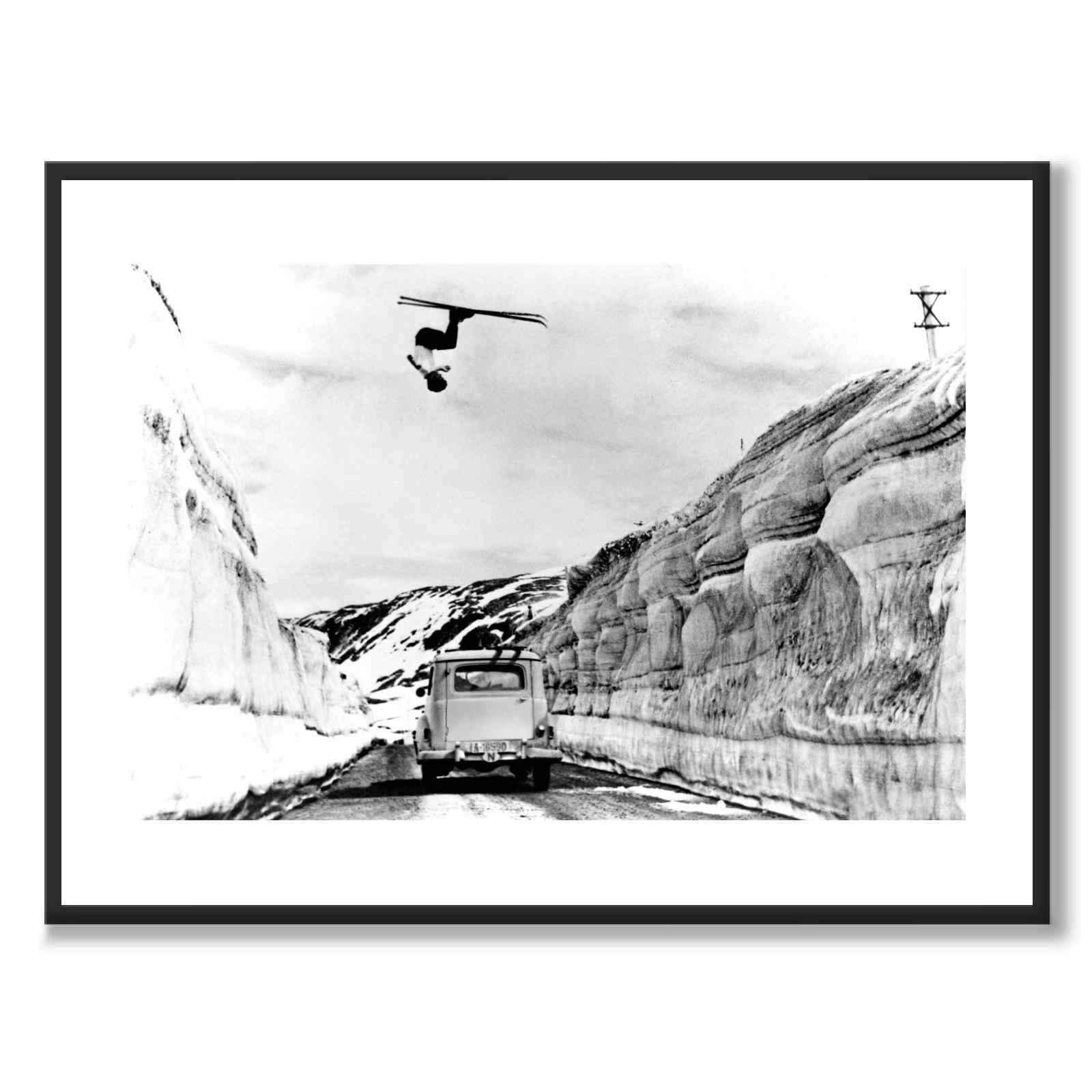 En vågal nordmann på ski gjør en tilbakevending over bil og vei i Videseter, Sogn og Fjordane i Norge en sommer på midten av 1900-tallet.