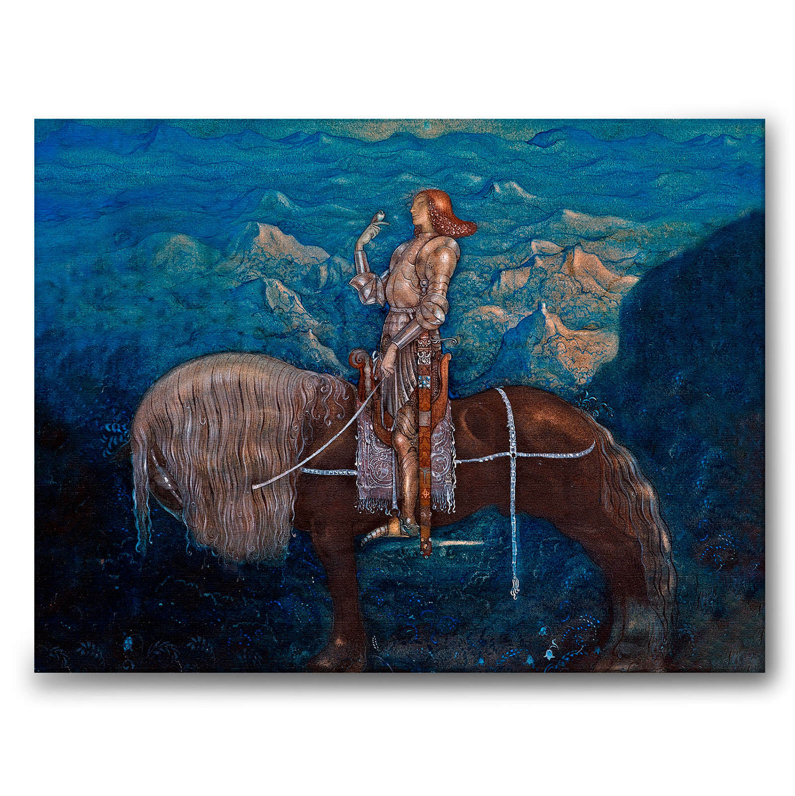 Lerret med maleriet En Riddare Red Fram av John Bauer fra 1915. Bildet var en illustrasjon til Jeanna Oterdahls eventyr i eventyrsamlingen Blant alver og troll .
