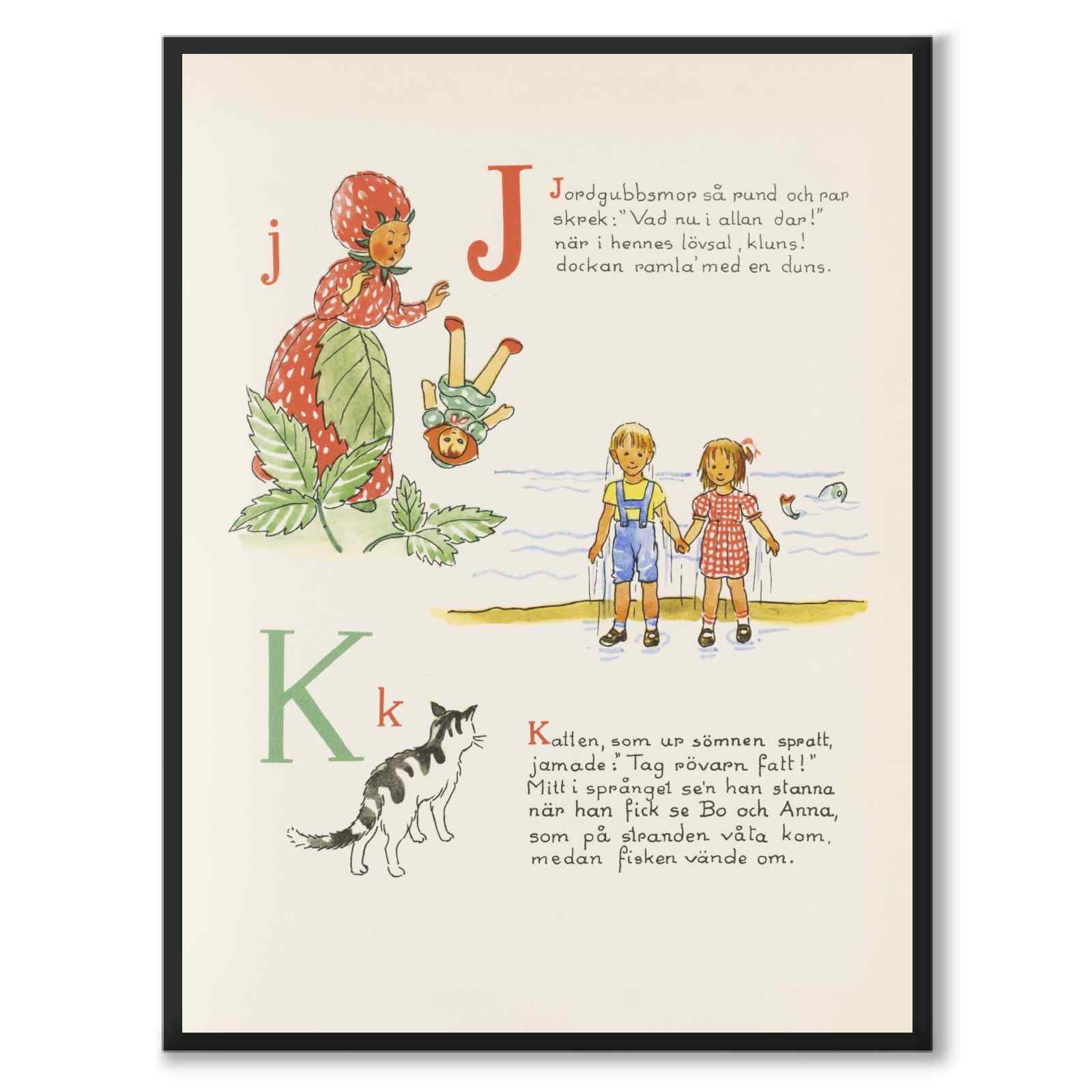 Boken ble brukt til å lære barna alfabetet på en underholdende og lærerik måte, da hver bokstav er knyttet til et bilde og et kort rim. I dette bildet er bokstavene J & K presentert, med illustrasjoner av et jordbær, "jordbærmor" og en katt.