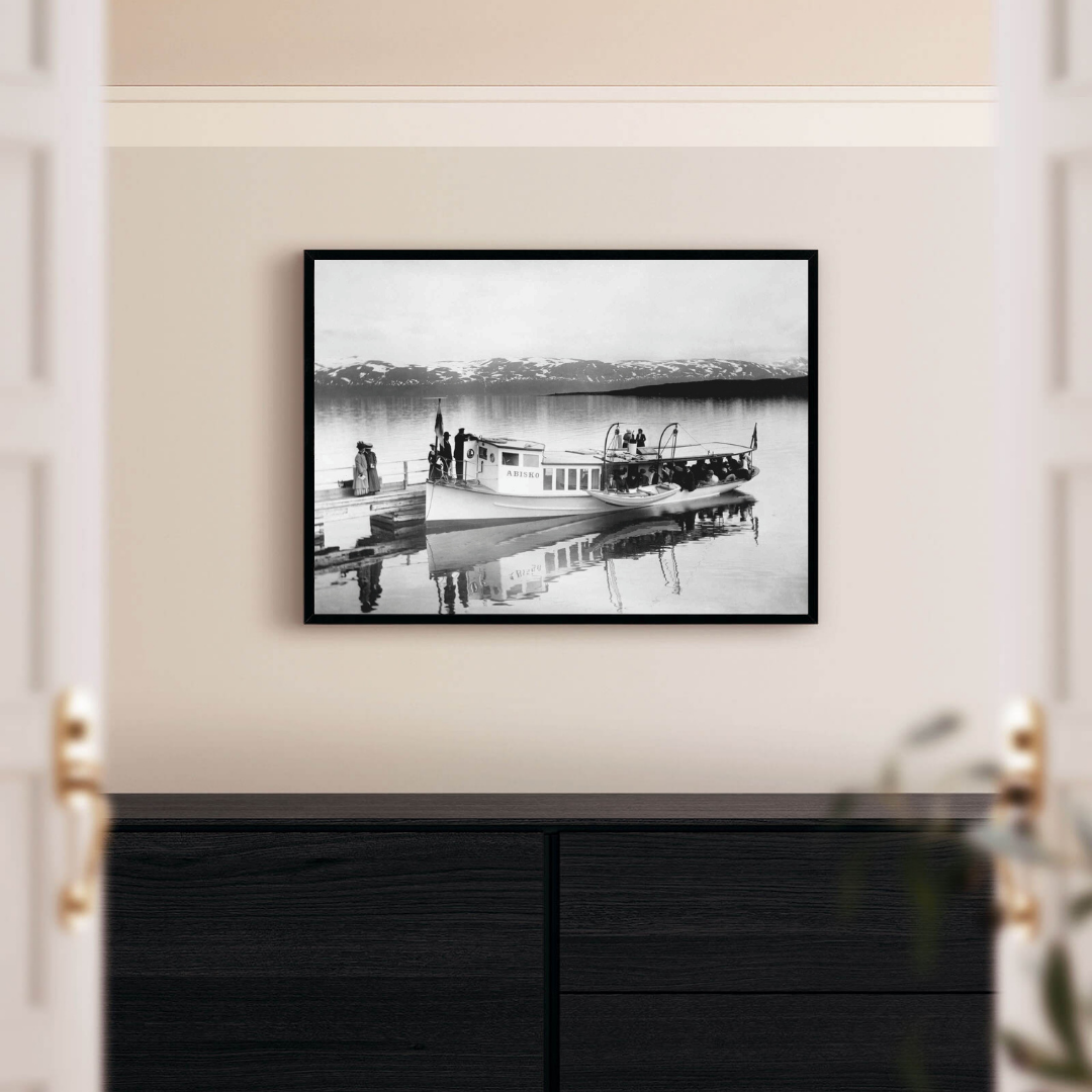 Plakat med motiver fra en dampbåt i Abisko i 1924. I løpet av 1920-årene tilbød Abisko turistturer over innsjøen Torneträsk ved hjelp av båter.