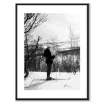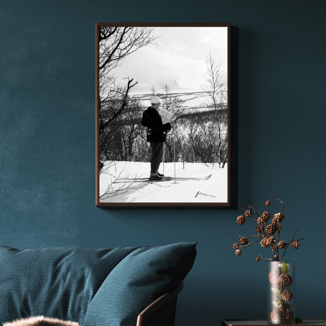 Plakat med motiv av en mann på langrennski, hvis blikk er rettet mot det majestetiske fjellandskapet i Abisko. Med et kart i hånden ser han ut til å navigere seg gjennom det vinterkledde landskapet. Abisko ligger i Nord-Sverige nær grensen til Norge og stedet byr på et mangfold av langrennsløyper som tiltrekker seg entusiaster fra nær og fjern.
