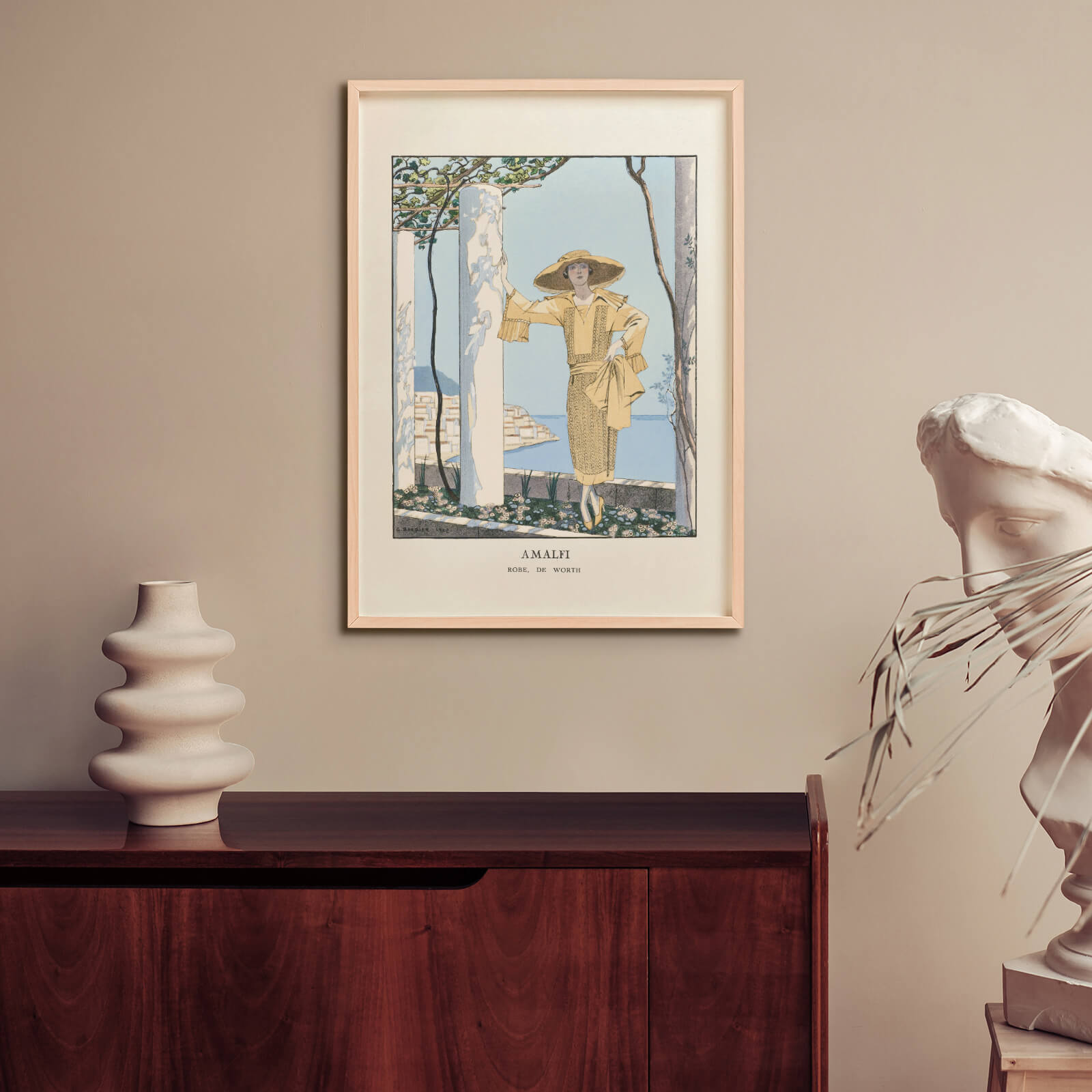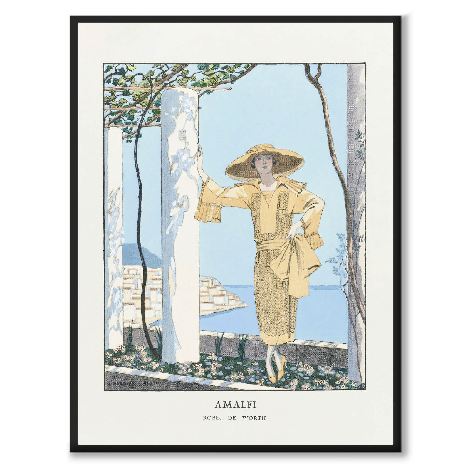 Plakat med illustrasjon fra et fransk motemagasin i 1922. På illustrasjonen ser du teksten Amalfi. Robe, de Worth - fransk for Amalfi. Kjole fra Worth.