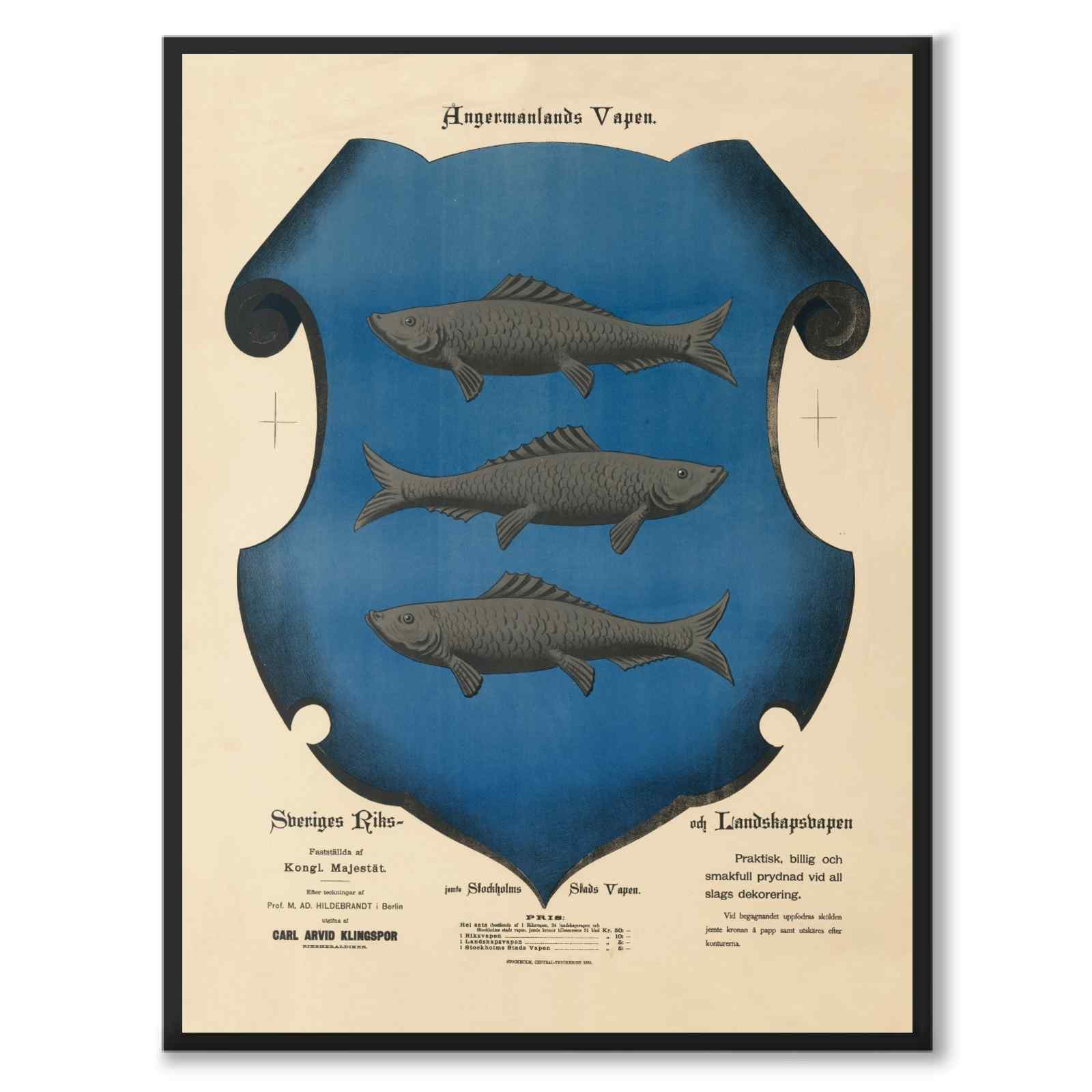Teksten over våpenskjoldet lyder: Ångermanlands Vapen. Nederst til venstre står det: "Sveriges Riks- och Landshapensvapen. Fastställda af Kongl. Majestät. Efter teckningar af Prof. M. AD. Hildebrandt i Berlin. Utgifna af Carl Arvid Klingspor."