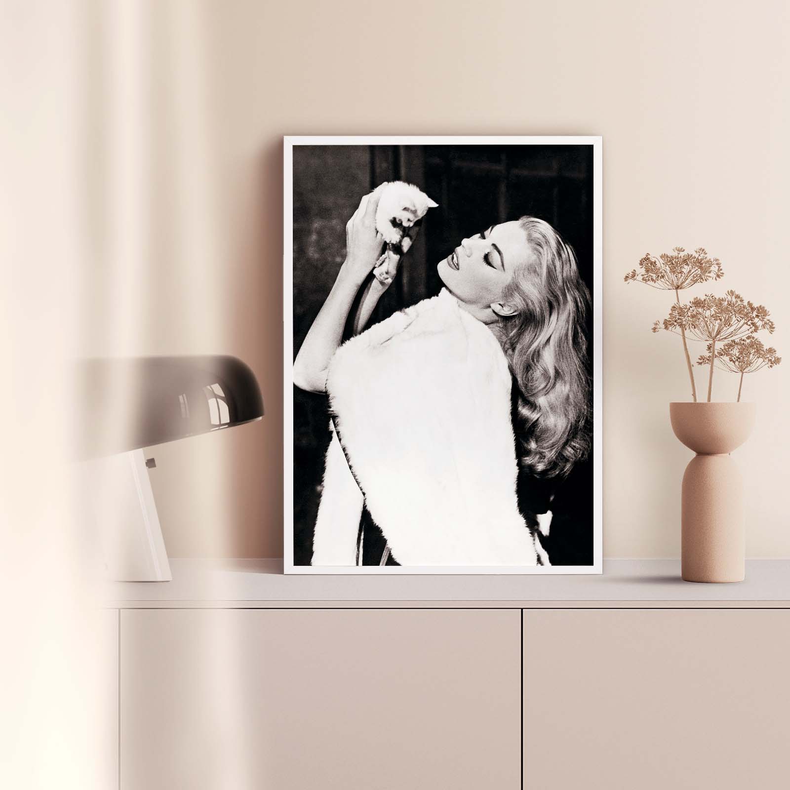 Plakat med et unikt bilde av Anita Ekberg og en hvit kattunge i 1960.