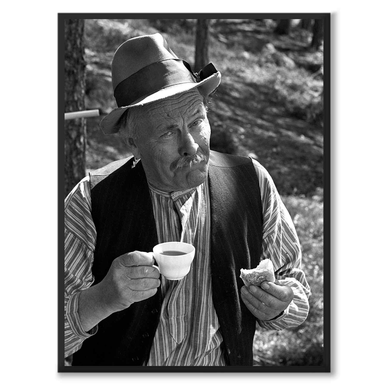 Åsa-Nisse ble spilt av skuespilleren John Elfström, som på bildet har tatt en kaffepause fra innspillingen som fant sted i Stockholm-regionen og Saltsjöbaden i løpet av mai og juni 1966.