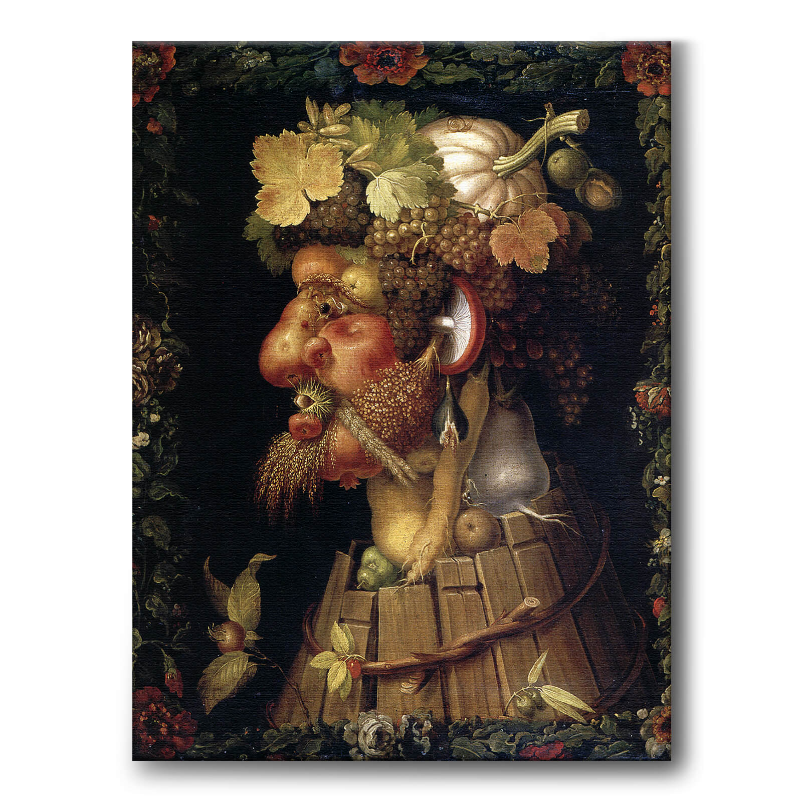 Lerret med maleriet "Høst" av den italienske renessansemaleren Giuseppe Arcimboldo (1527-1593) som er kjent for sine fantasifulle portretter hvor han bruker gjenstander som frukt, blomster og bøker for å gjenskape ansikter.
