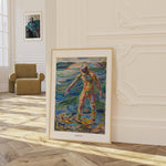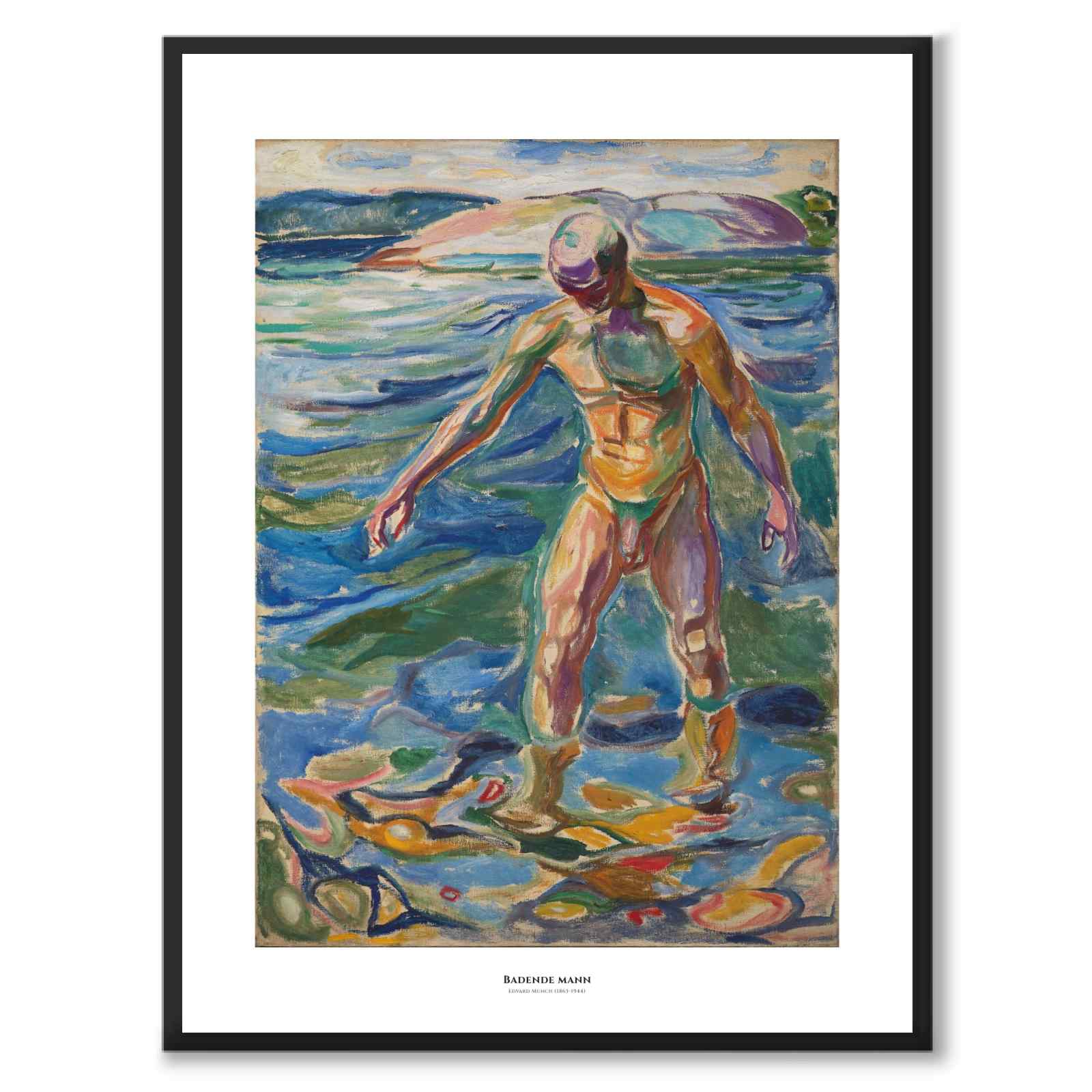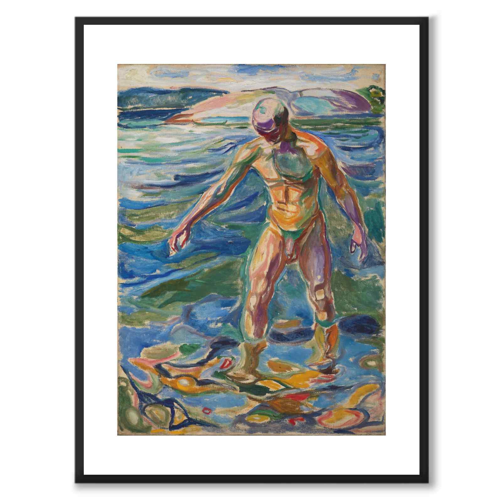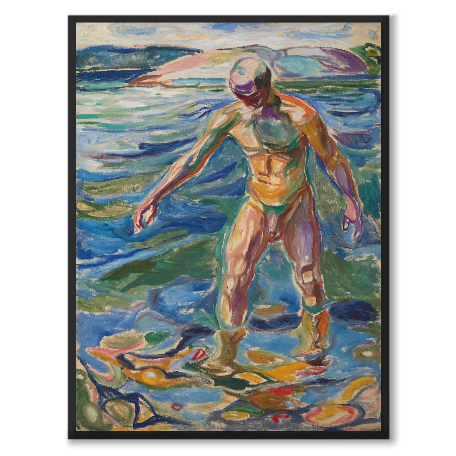 Maleriet viser en mann som bader i vann og er et eksempel på Munchs senere arbeid hvor han eksperimenterer med farger og form for å uttrykke følelser og eksistensielle temaer. Mannen som står i vannet kan sees på som et uttrykk for renselse, men også som en måte å utforske følelsesmessige og psykologiske tilstander.