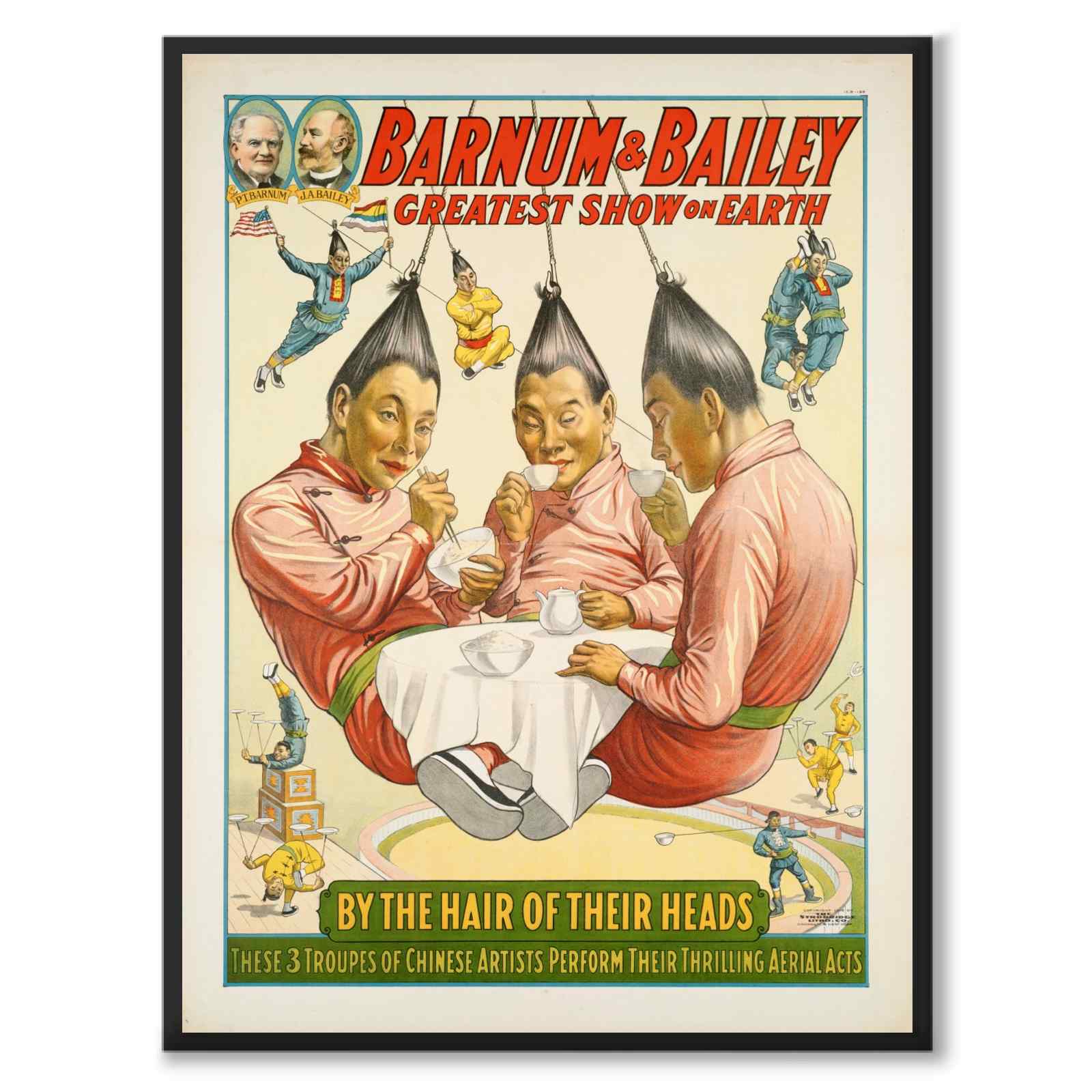 Barnum & Bailey-sirkuset var kjent for sine store og ofte overdrevne handlinger. I øverste hjørne av plakaten er bilder av P.T. Barnum og James Bailey, de to grunnleggerne av sirkuset, styrker sirkusmerket og deres identitet som verdens største underholdning.