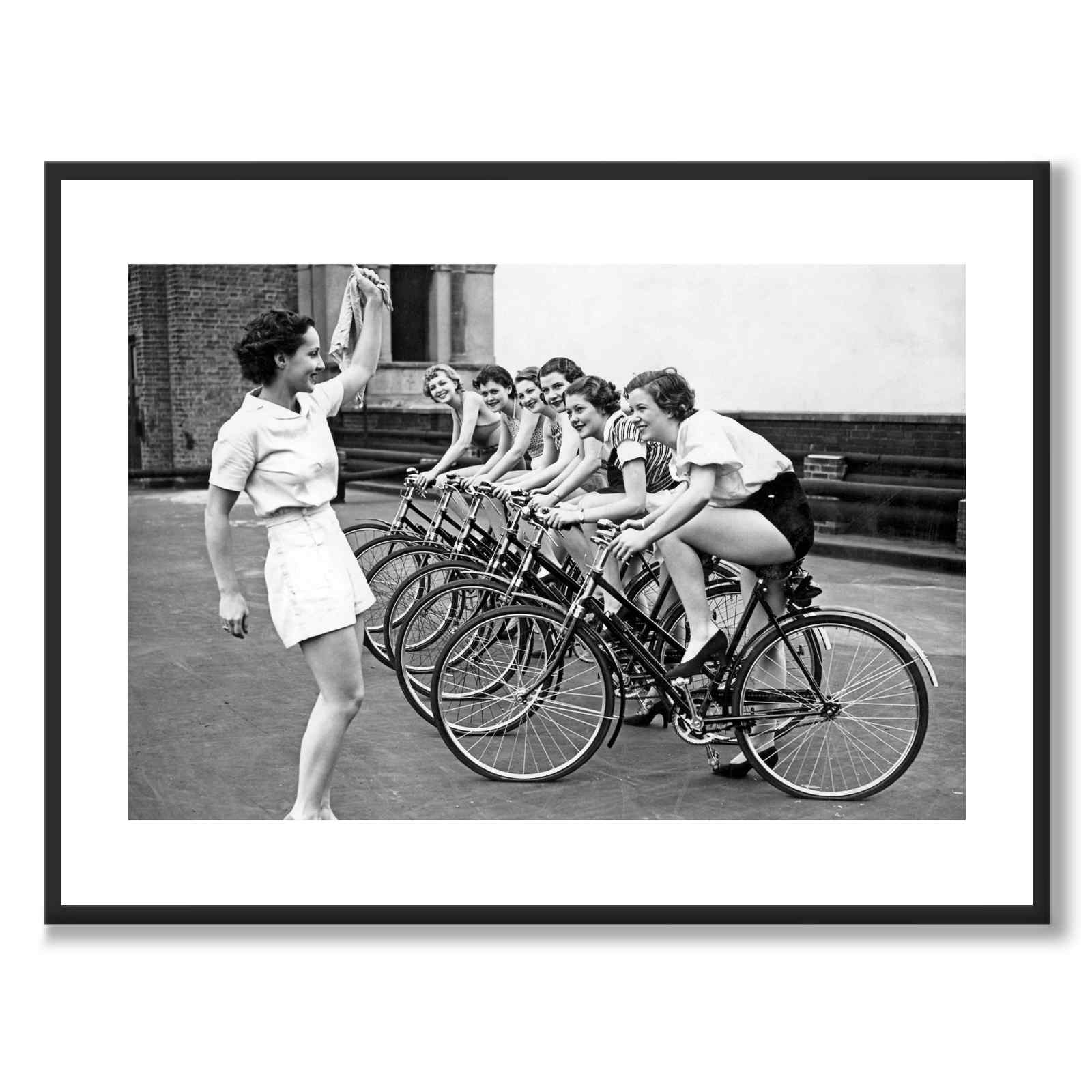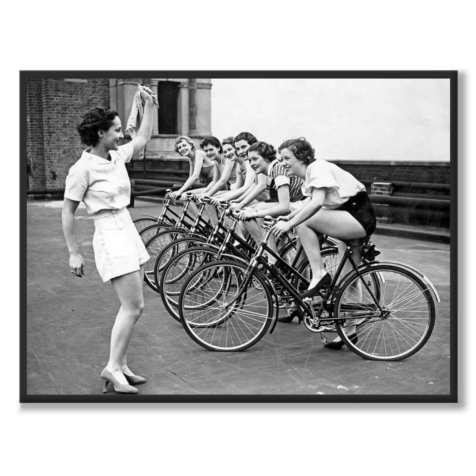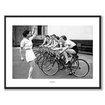 Plakat med et vintagefotografi av kvinner før et sykkelritt på 1930-tallet. På bildet ser vi kvinnene gjøre seg klare til startskuddet, som utføres av en kvinne med et tøystykke.