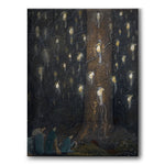 Lerret med maleriet The Song of the Birds av John Bauer fra 1910. Tre nisser ser forundret på et stort antall magiske fugler som sitter på grenene til en stor gran og lyser opp den mørke skogen. Ikoniske John Bauer er kjent for sine eventyrmotiver med nisser og prinsesser og han har hatt stor innflytelse på nordisk folklore og historiefortelling. Lurer du på å vite mer om troll? Les mer her: Dombergets troll .