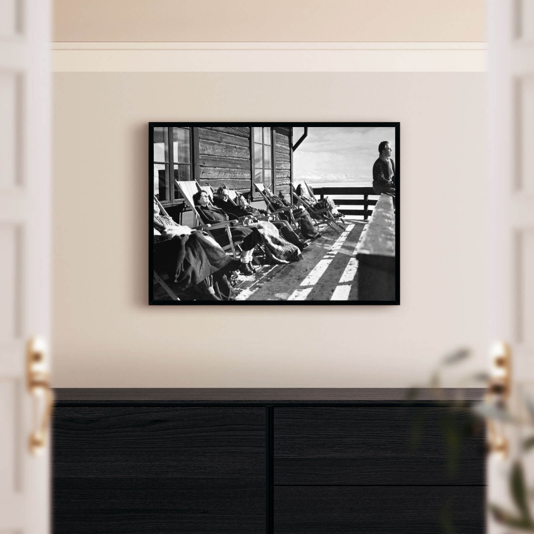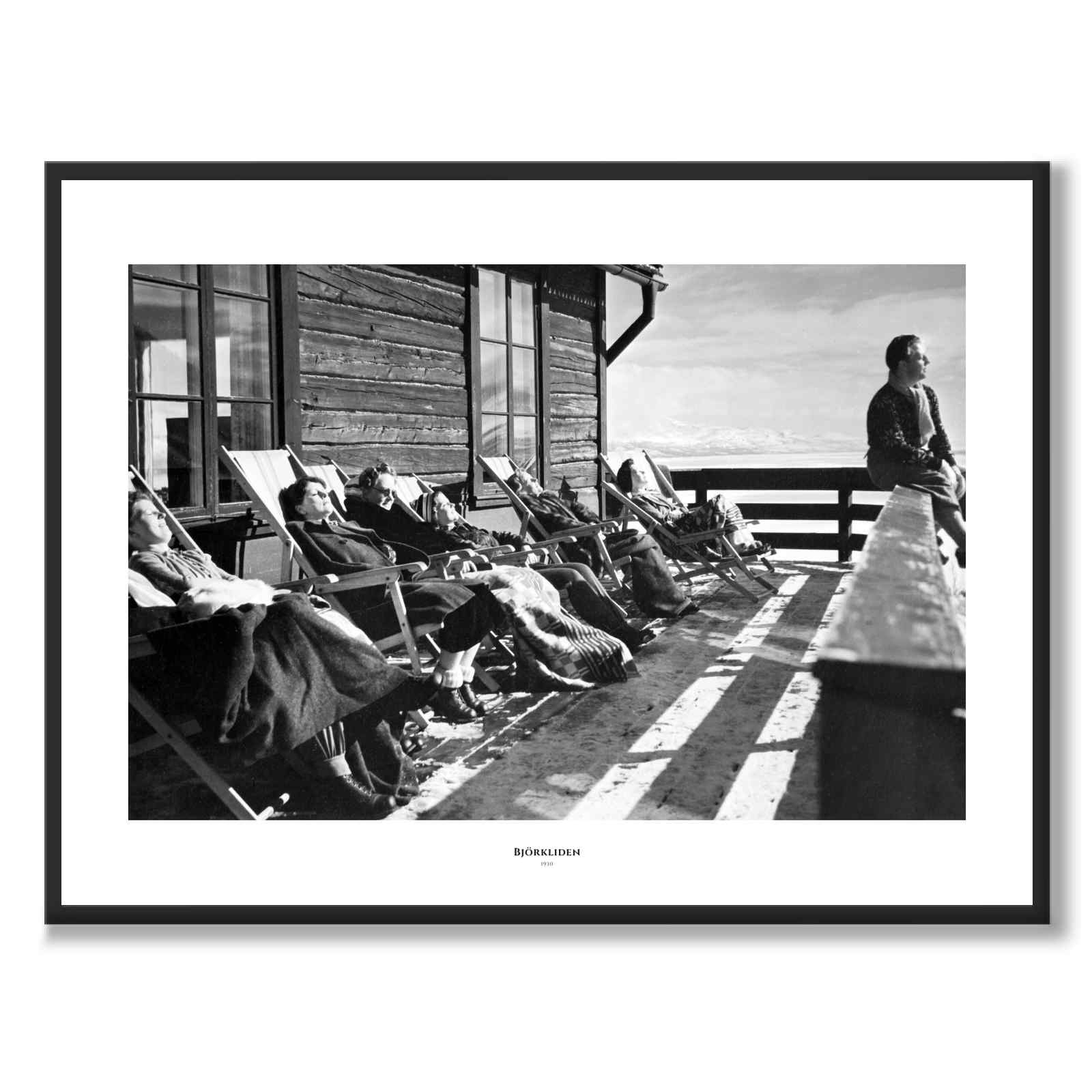 Plakat med motiv fra en solfylt Björkliden i 1930. I løpet av 1930-årene vokste Björkliden, en landsby og fjellstasjon i Nord-Sverige, til et populært reisemål for eventyrlystne reisende. Beliggende i et imponerende fjellandskap, tilbød Björkliden aktiviteter som fotturer, fiske og ski både sommer og vinter. Bildet viser flere av disse reisende som nyter solværet i en snødekt Björkliden.