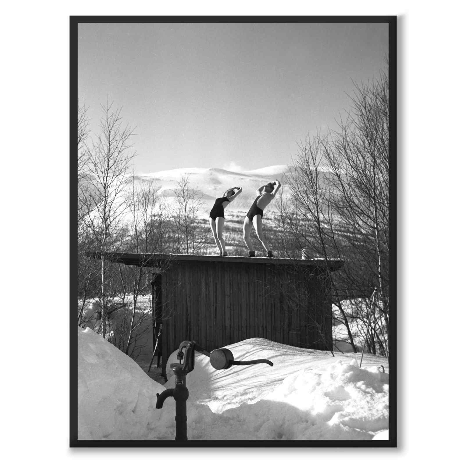 På bildet ser vi Iris og Bertil Thorelli drive med turn på taket av hytta i solskinnet. Bertil er innkalt og avtjener militærtjeneste i fjellområdene, og han og kona bor i en av Björklidens hytter i denne perioden. De er begge kledd i tidstypiske badedrakter.