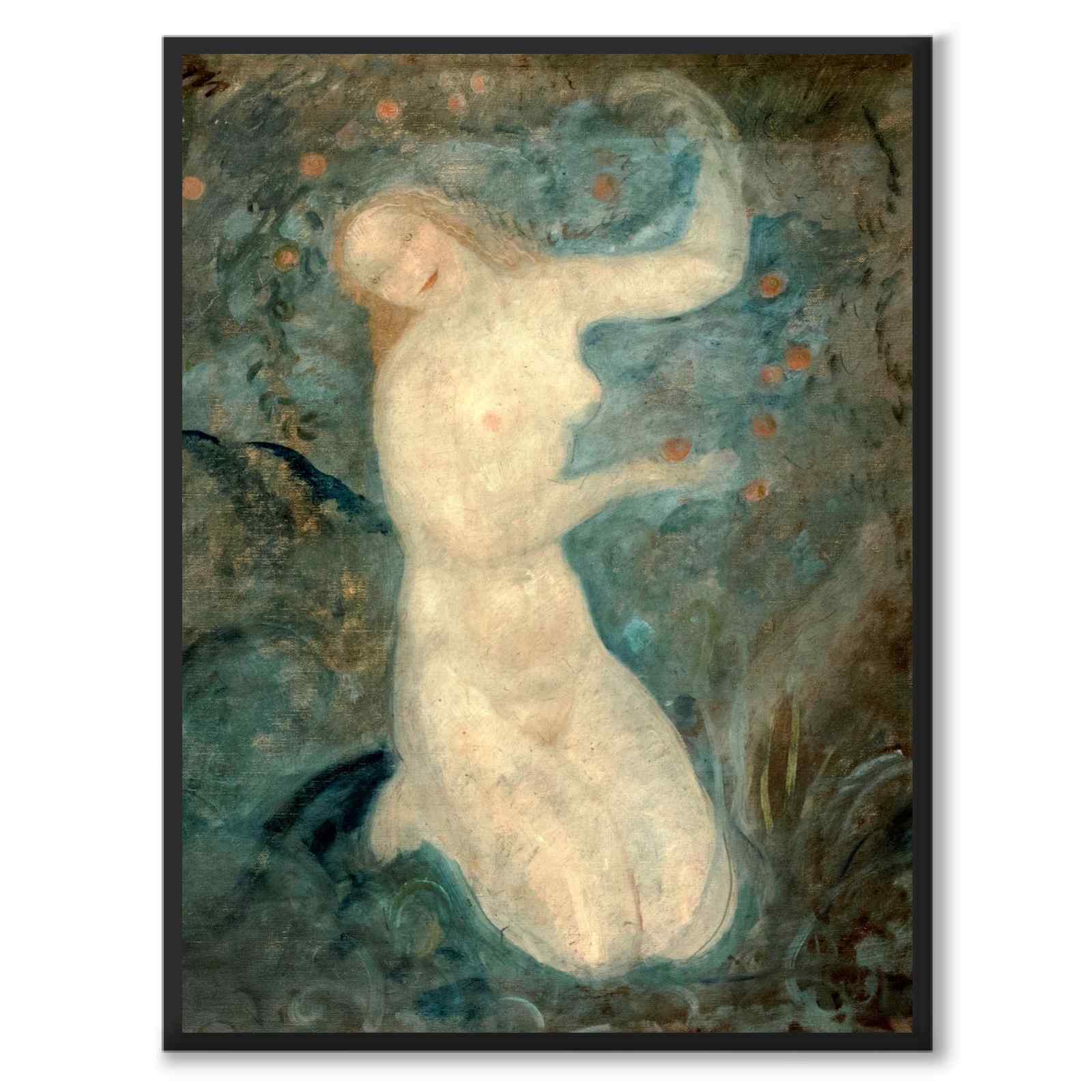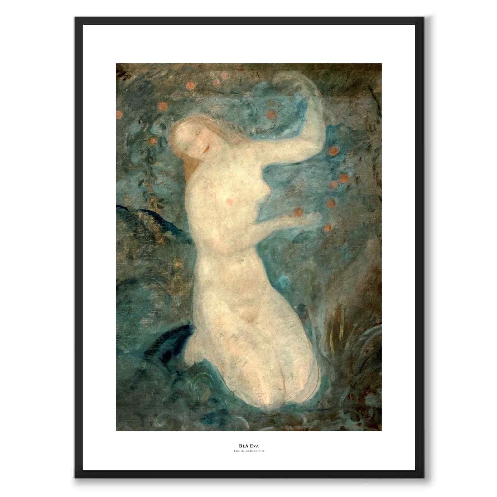 På bildet ser vi en naken kvinne som kneler i et spredt landskap av planter i blå nyanser. Blikket hennes er rettet mot en svart slange til venstre. Det ser ut til at hun plukker frukten som henger fra treet over henne. Er det den forbudte frukten i Edens hage? På hengerammen som tilhører originalmaleriet står det: "Blå prinsesse 1918" og "Eva med slangen". Verket er kjent som Blue Eve og er typisk for den monumentale kunsten som Bauer fokuserte på mellom 1915-1918 da han sa opp som illustratør for Among Alves and Trolls og ville gjøre noe nytt enn sine klassiske eventyrmotiver.