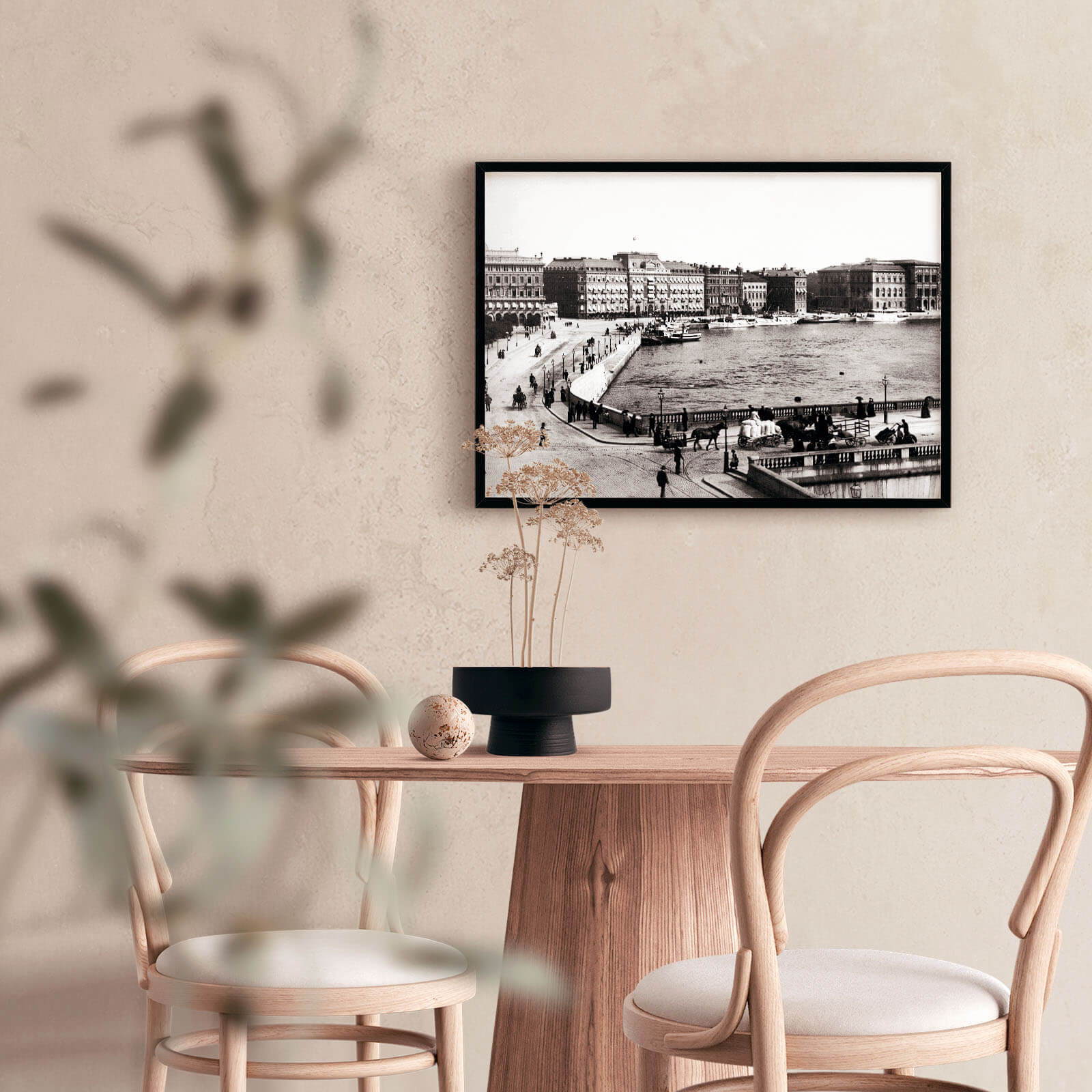 Plakat med gammelt fotografi av Norrbro og Blasieholmen på slutten av 1800-tallet. Langs bekkekaia i bakgrunnen ser vi Grand Hotel og Nasjonalmuseet.