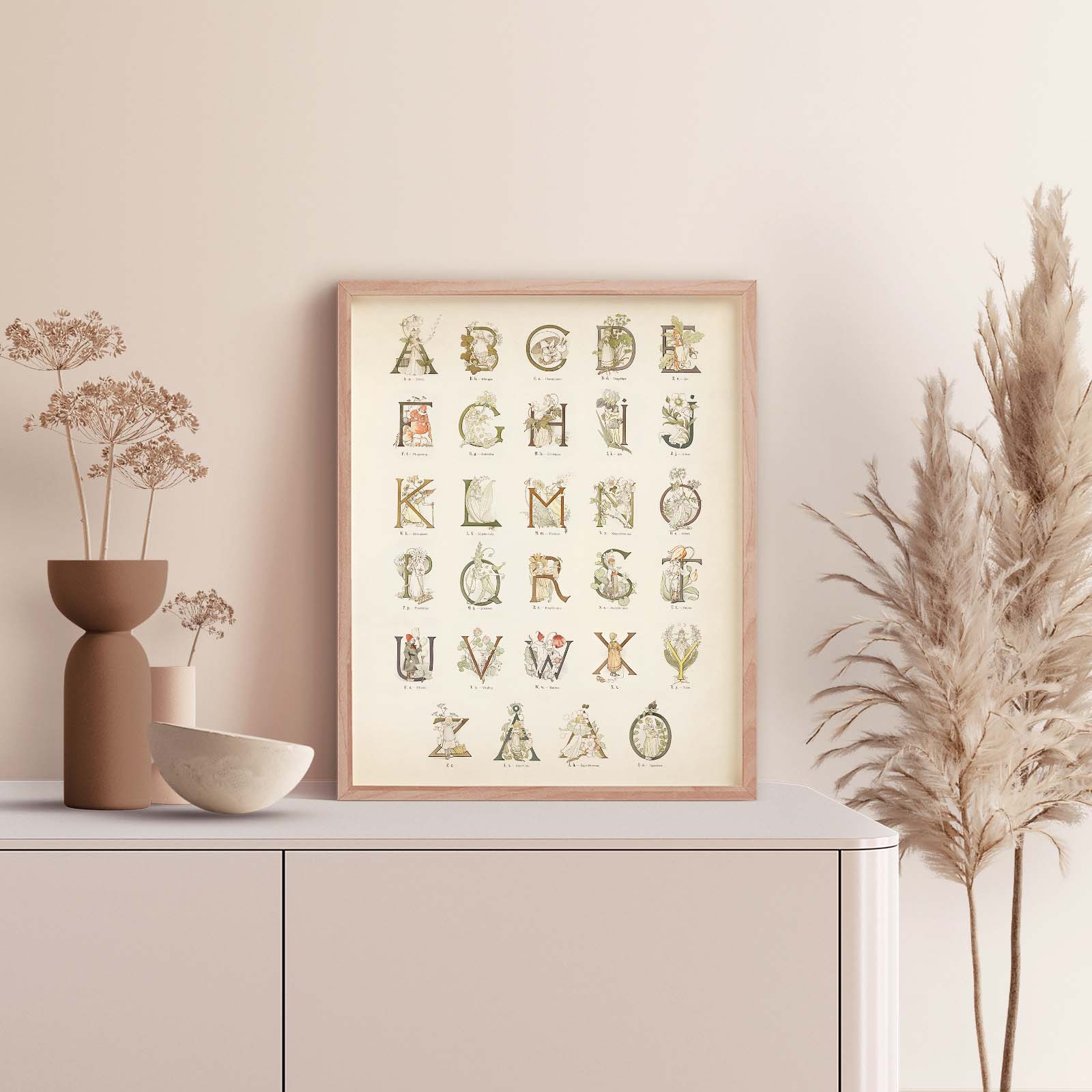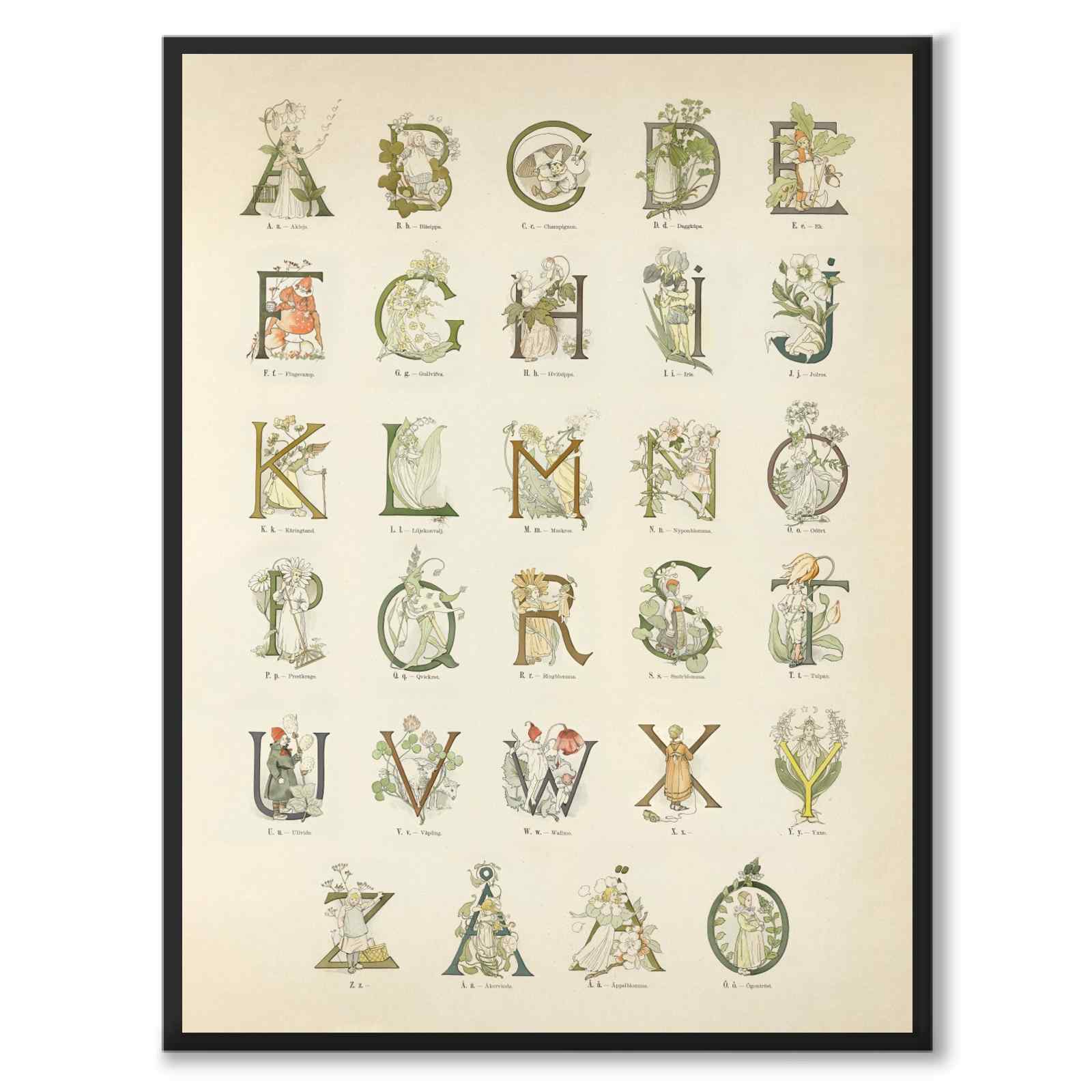 Plakat med, kanskje Sveriges mest elskede alfabet gjennom tidene, nemlig Prinsenes blomsteralfabet av Ottilia Adelborg. Ottilia tegnet illustrasjonen i 1892 og er en kjent svensk kunstner og forfatter som har blitt kjent som forfatteren av den svenske barneboken.