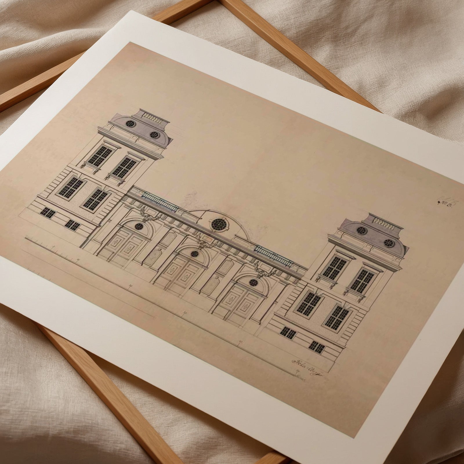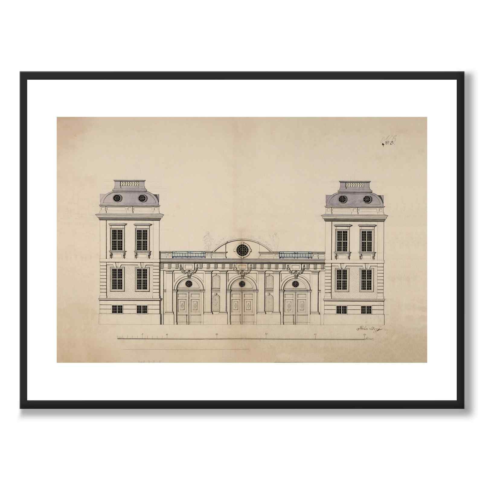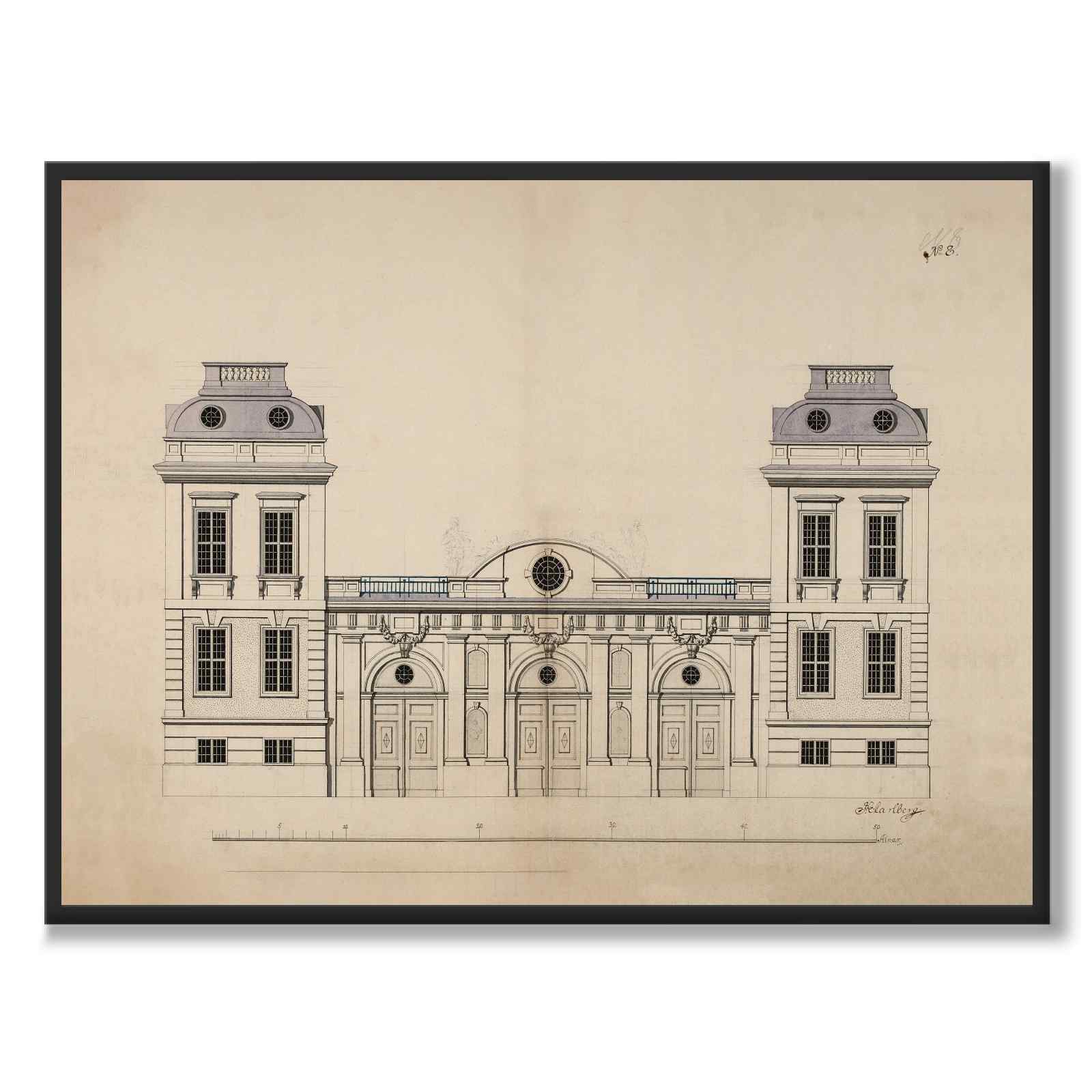 Plakat med tegning for Bondeska-palasset i Stockholm, hvor Johan Eberhard Carlberg var stadsarkitekt. Etter at palasset ble kjøpt som nytt rådhus i 1730, foreslo Carlberg en utvidelse av palasset. Tegningen viser en fasadetegning som gjenspeiler endringene og tilleggene han planla for bygget.