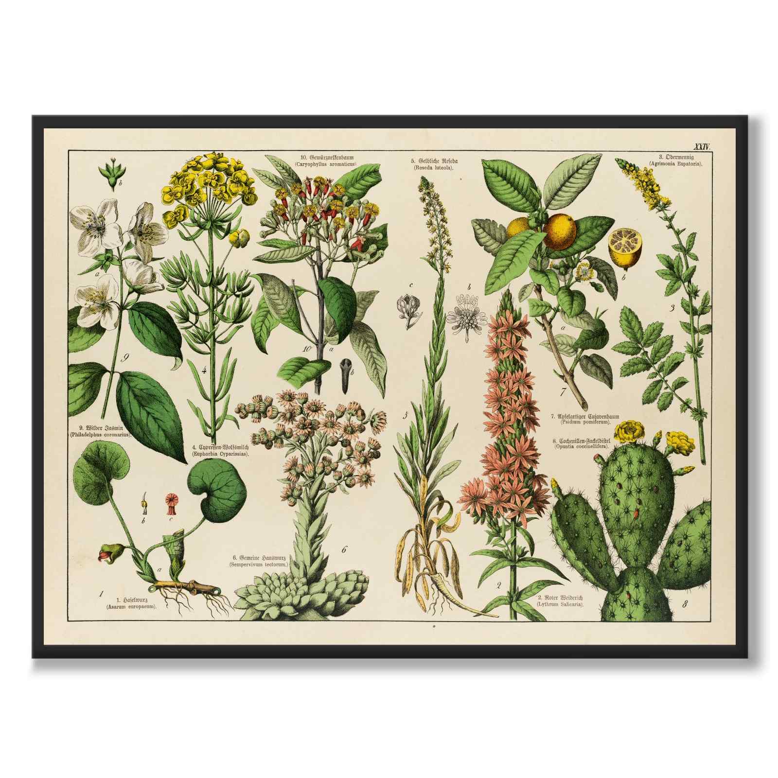 En botanisk, vintage plakat med forskjellige typer blomster og planter, merket med deres vitenskapelige og latinske navn.