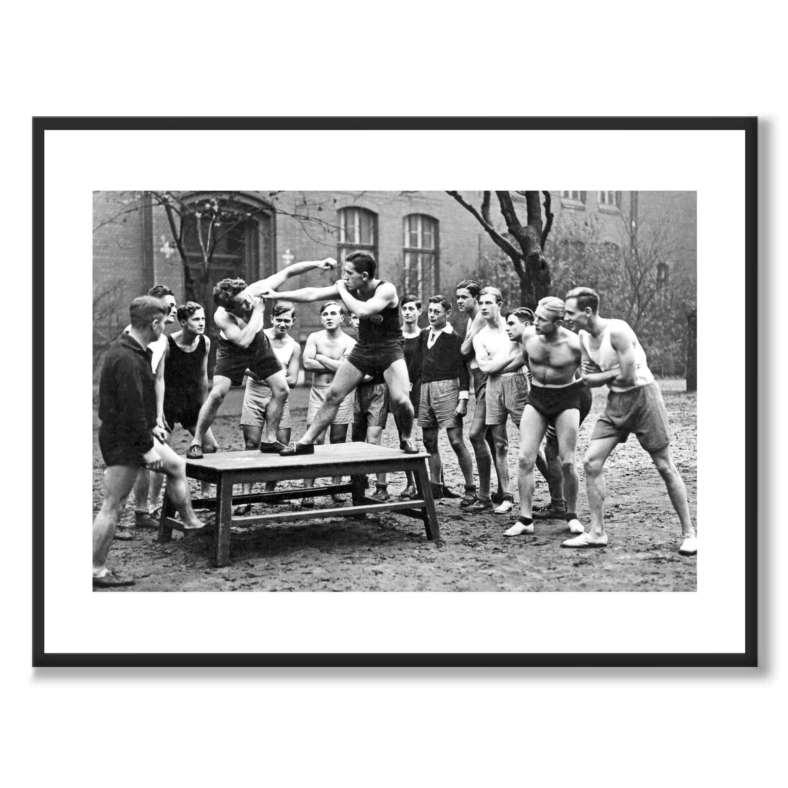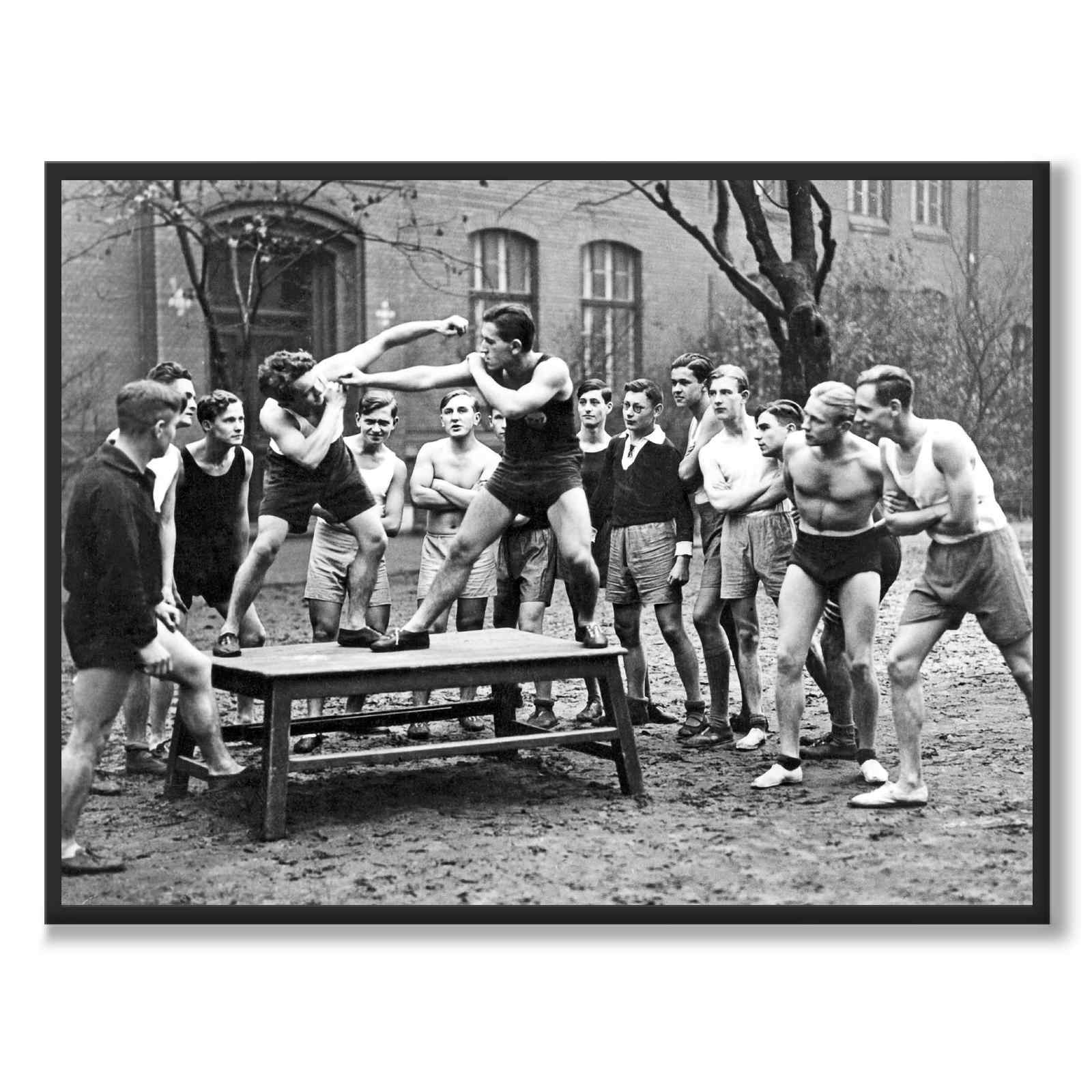 Plakat med en gruppe unge menn som så på når to slåss på 1930-tallet. De er trolig klassekamerater og står utenfor en skole, steinbygningen ser vi i bakgrunnen.