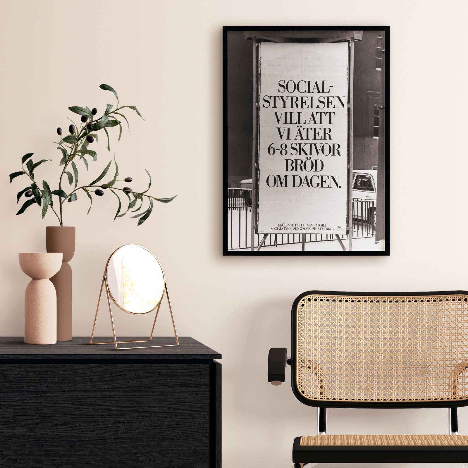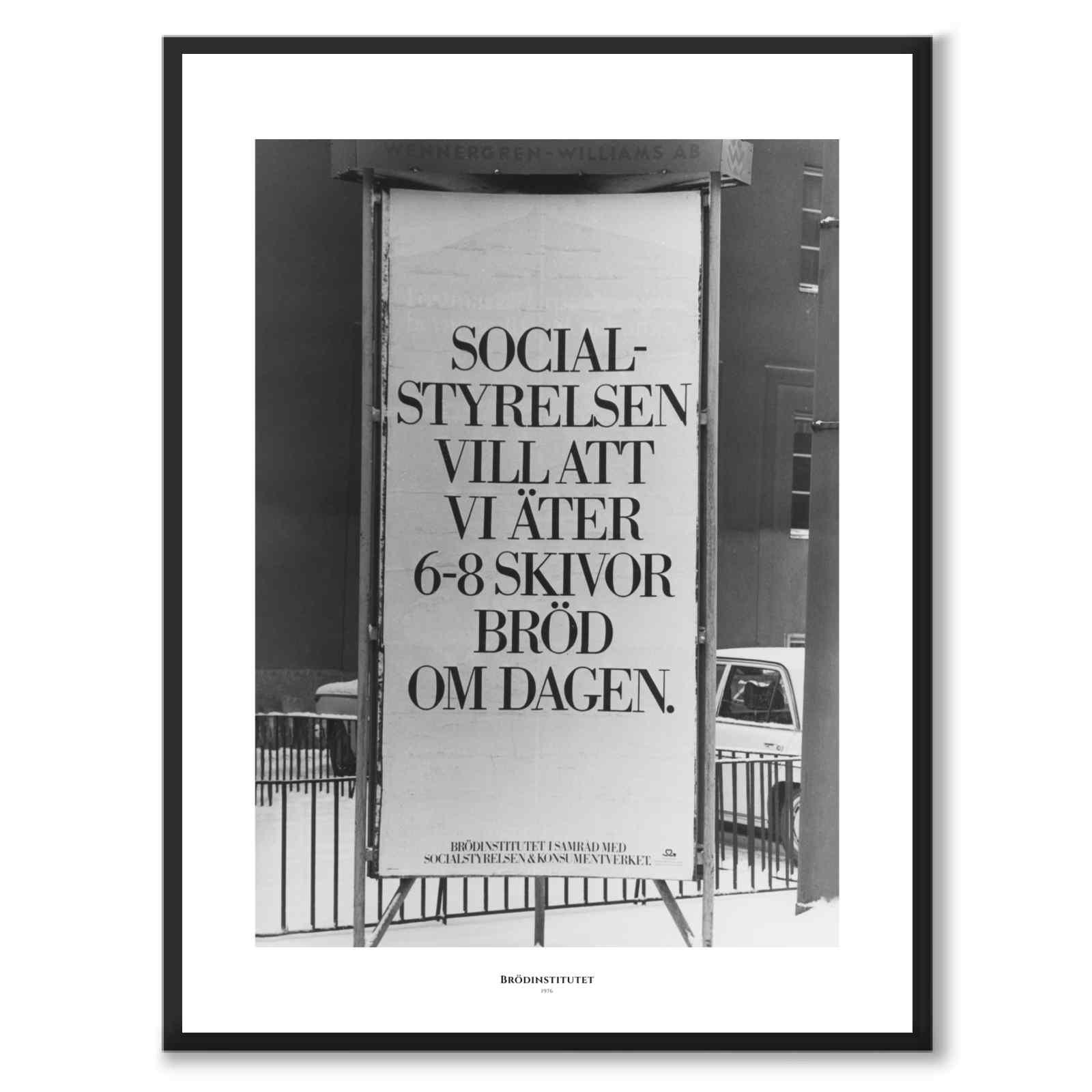 Plakat med en morsom reklamekampanje fra Sverige i 1976. En reklamesøyle utbasunerer budskapet: «Socialstyrelsen vil at vi skal spise 6-8 brødskiver om dagen». Kampanjen er imidlertid ikke regjering eller fra Socialstyrelsen, men fra Svenska Brödinstitutet.