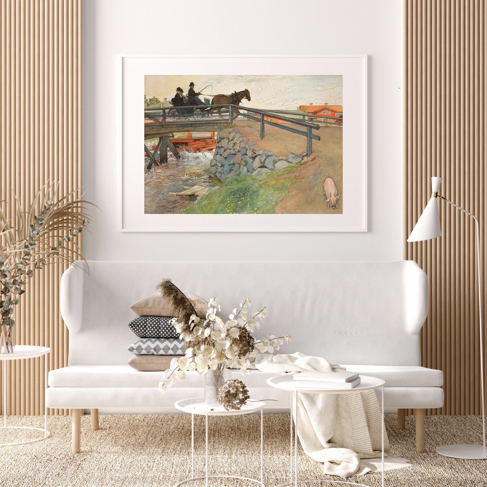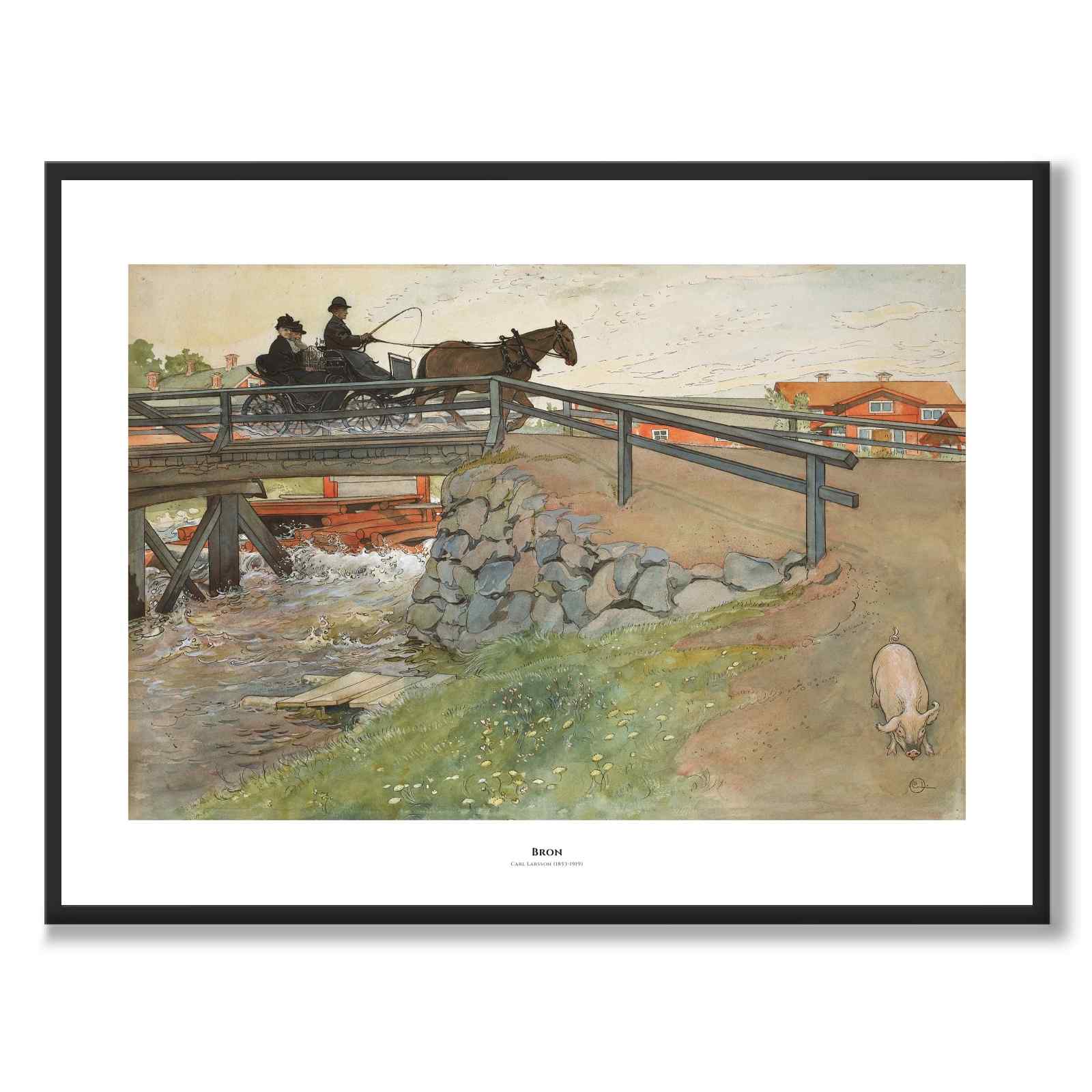 Plakat med maleriet Broen laget av Carl Larsson. Maleriet er kjent for sine idylliske og fargerike skildringer av det svenske landskapet og folkelivet i siste del av 1800-tallet og begynnelsen av 1900-tallet. Det er sommer og et lag ruller sakte over broen med et livlig stryk. En gris går på landeveien og i bakgrunnen ser vi vakre røde hus.