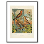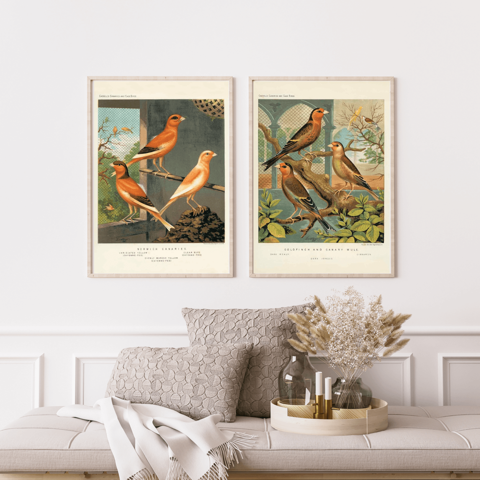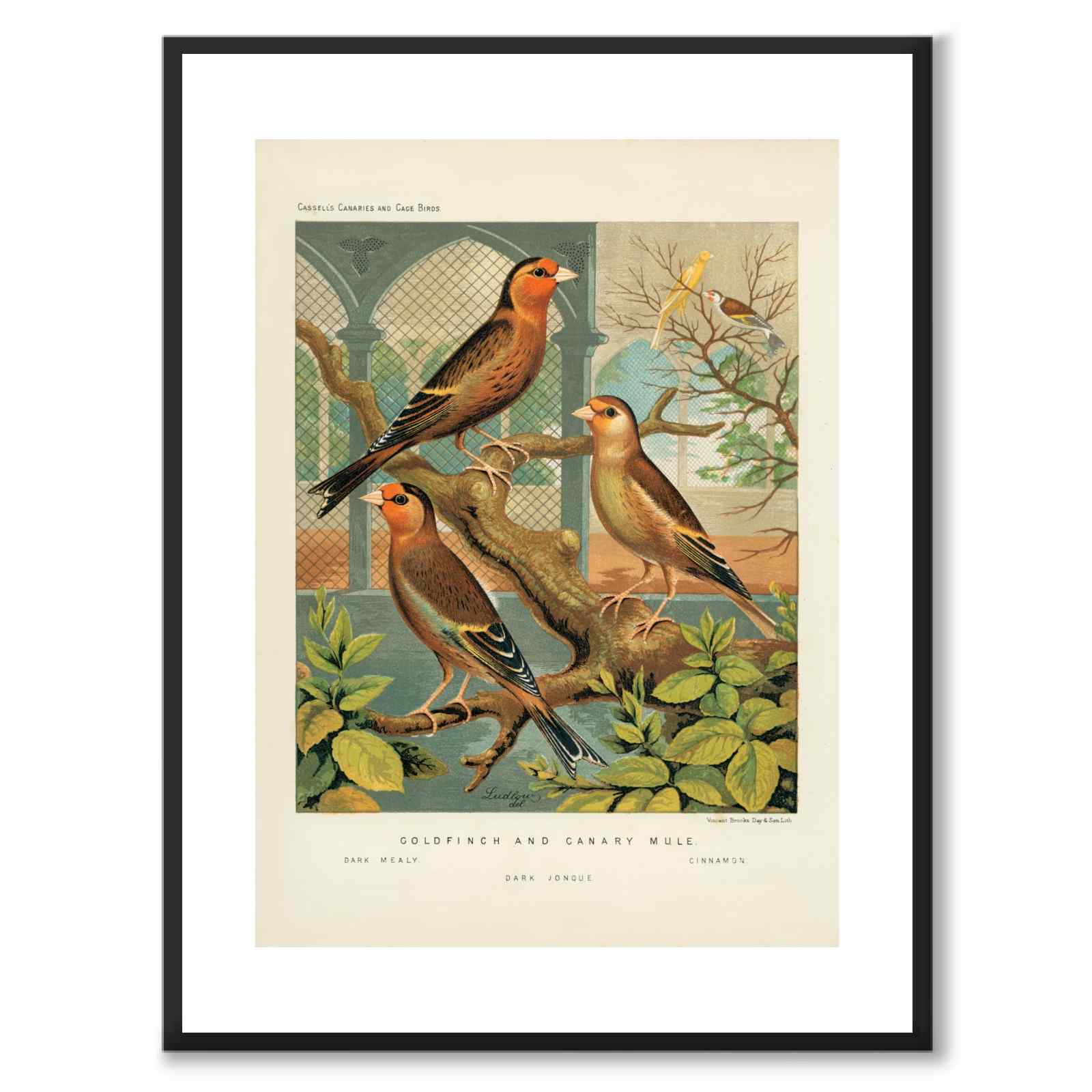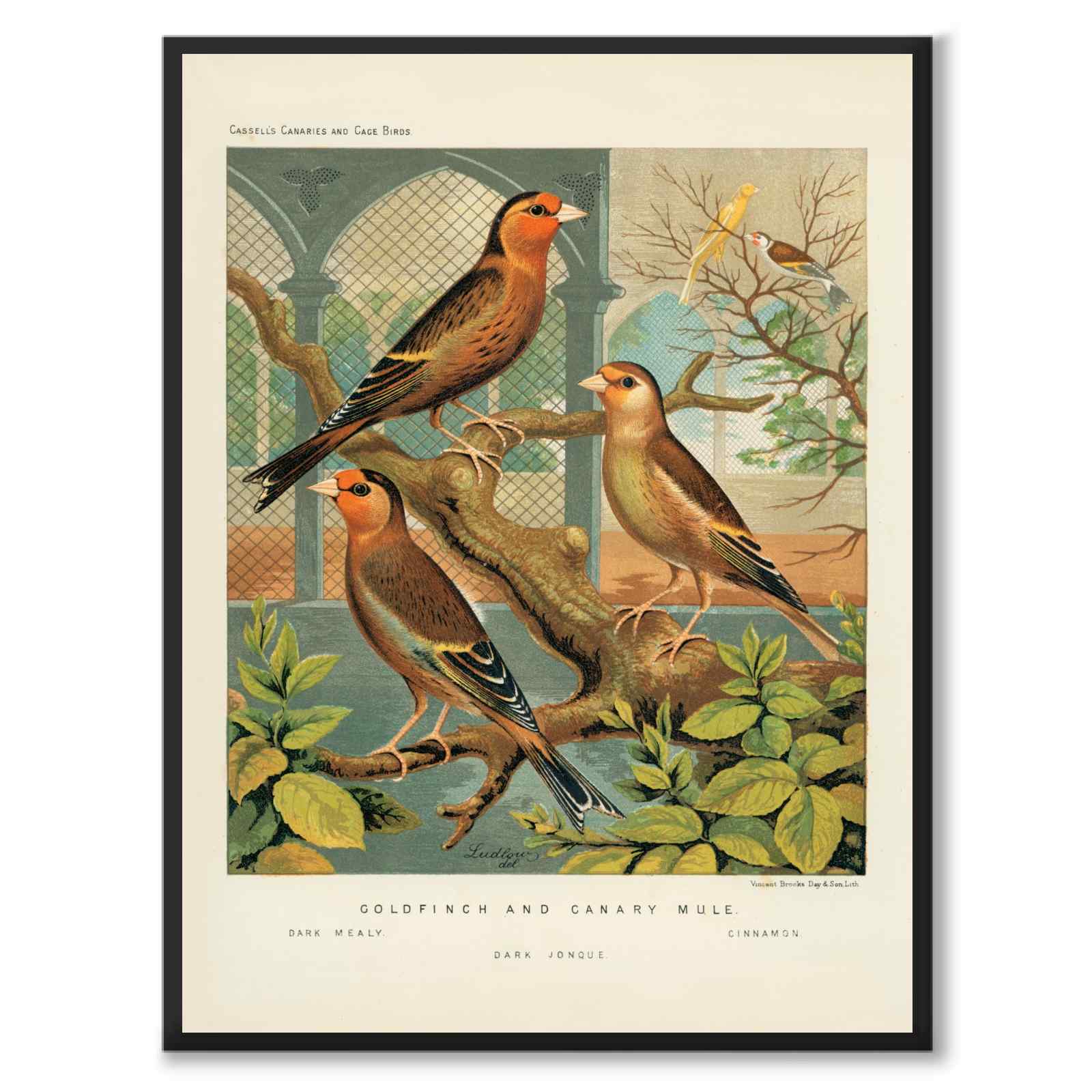 Plakat med illustrasjonen Cassel fra boken The Illustrated Book of Canaries and Cage-Birds . I denne illustrasjonen ser vi artene gullfink og kanarimuldyr.
