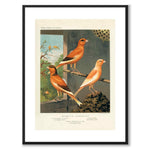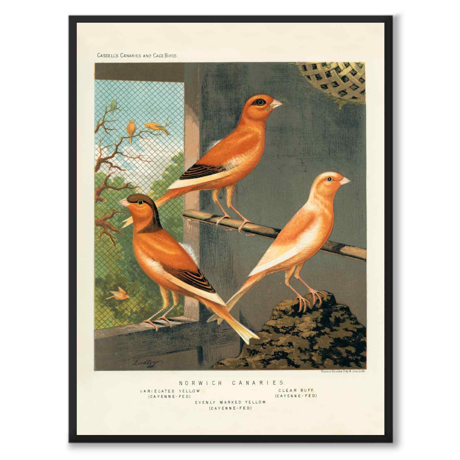 Plakat med illustrasjonen Cassel fra boken The Illustrated Book of Canaries and Cage-Birds . I denne illustrasjonen ser vi arten Norwhich Canaries med tre forskjellige fjærdraktmarkeringer.