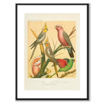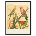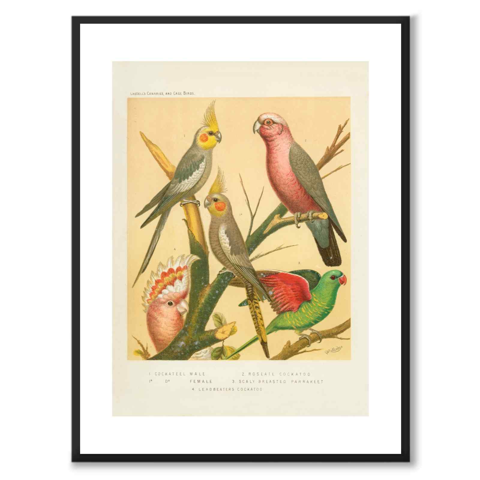 Plakat med illustrasjonen Cassel fra boken The Illustrated Book of Canaries and Cage-Birds . I denne illustrasjonen ser vi forskjellige papegøyer som tilhører kakaduarten.