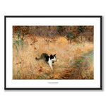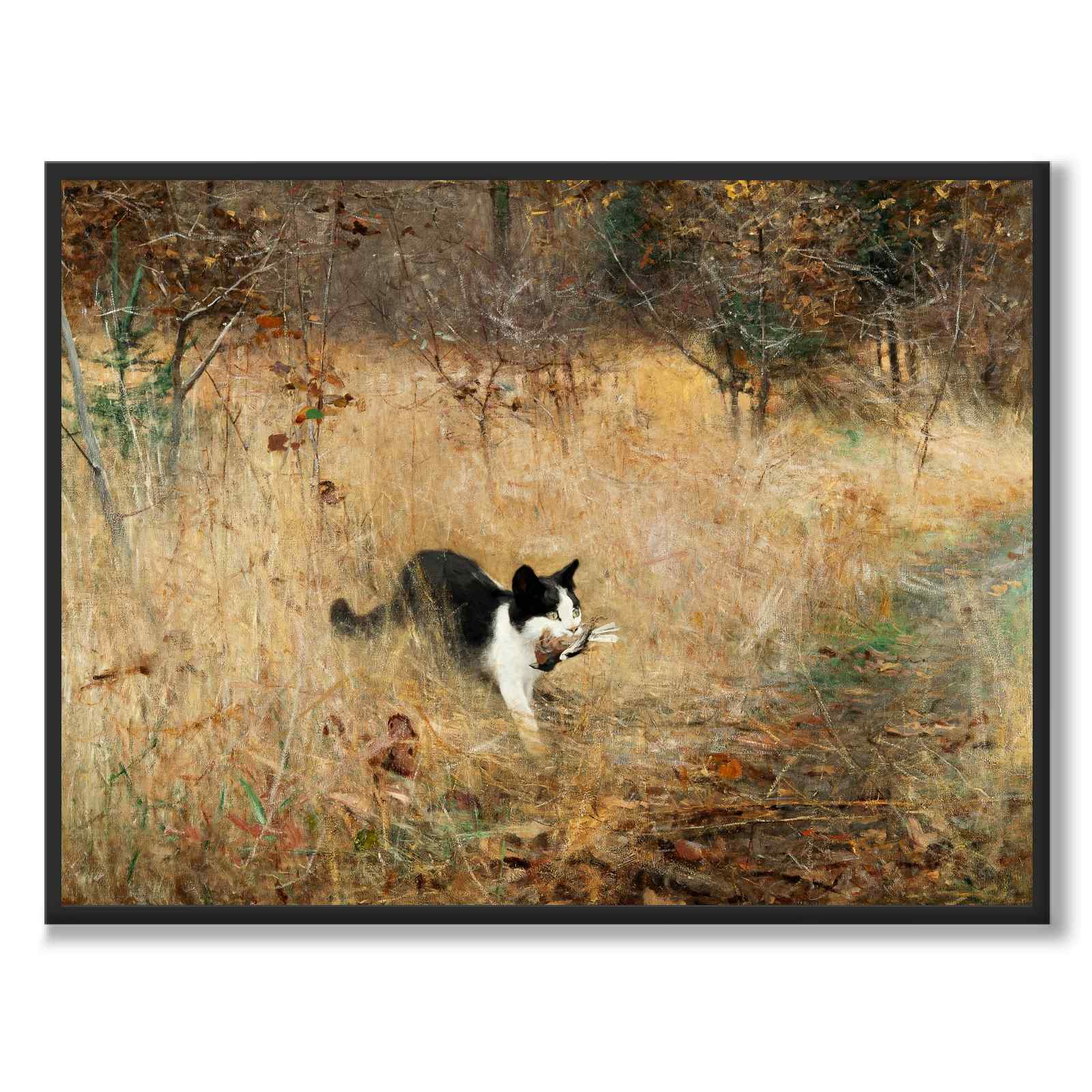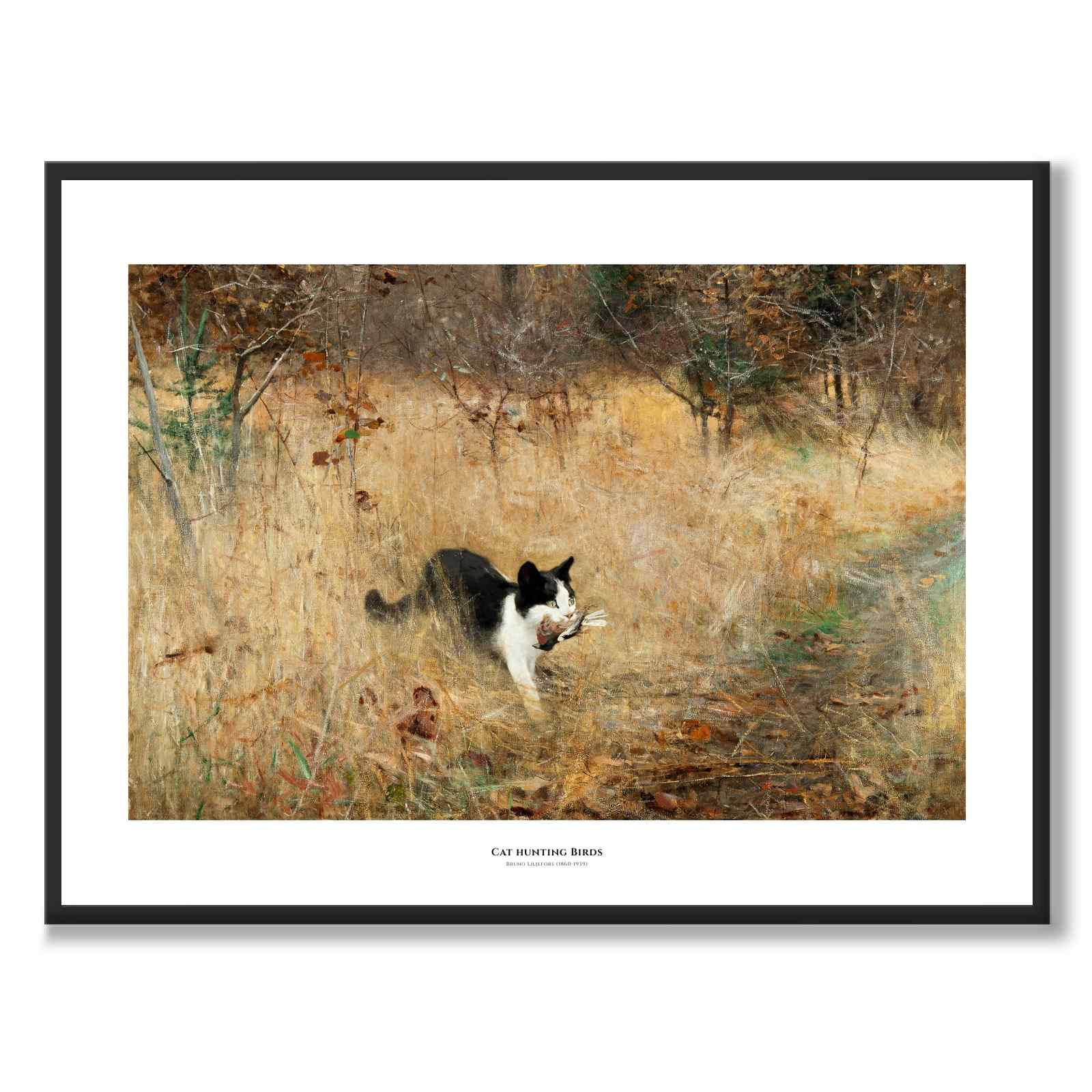 Plakat med maleriet Cat hunting Birds av Bruno Liljefors fra 1883. Maleriet viser en katt med sin fangst i et vakkert naturlandskap.