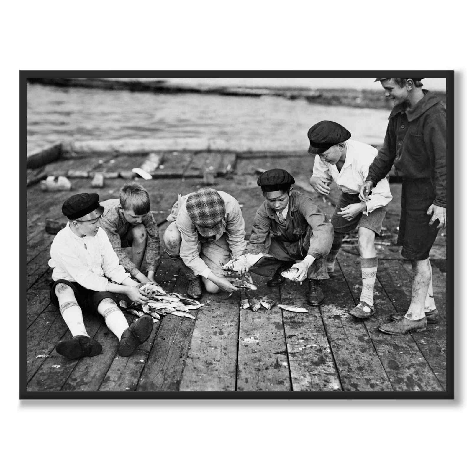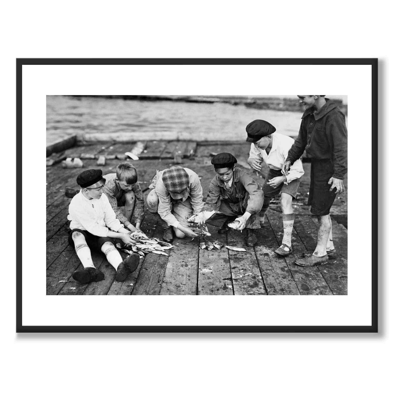 Gutter sammenligner dagens fangst av fisk. Bildet er tatt på kaia ved slusen i Stockholm i 1931.