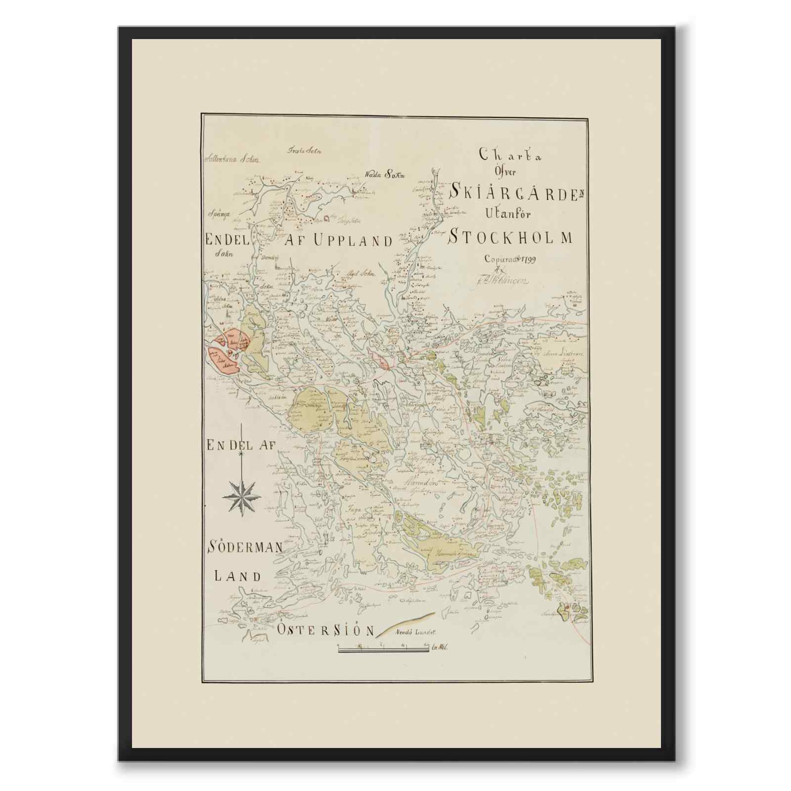 Plakat med et vakkert illustrert " Charter over skiskjærgården utenfor Stockholm ". Det detaljerte kartet over Stockholms skjærgård ble håndtegnet av Fredrik Adolf Wiblingen i 1799.