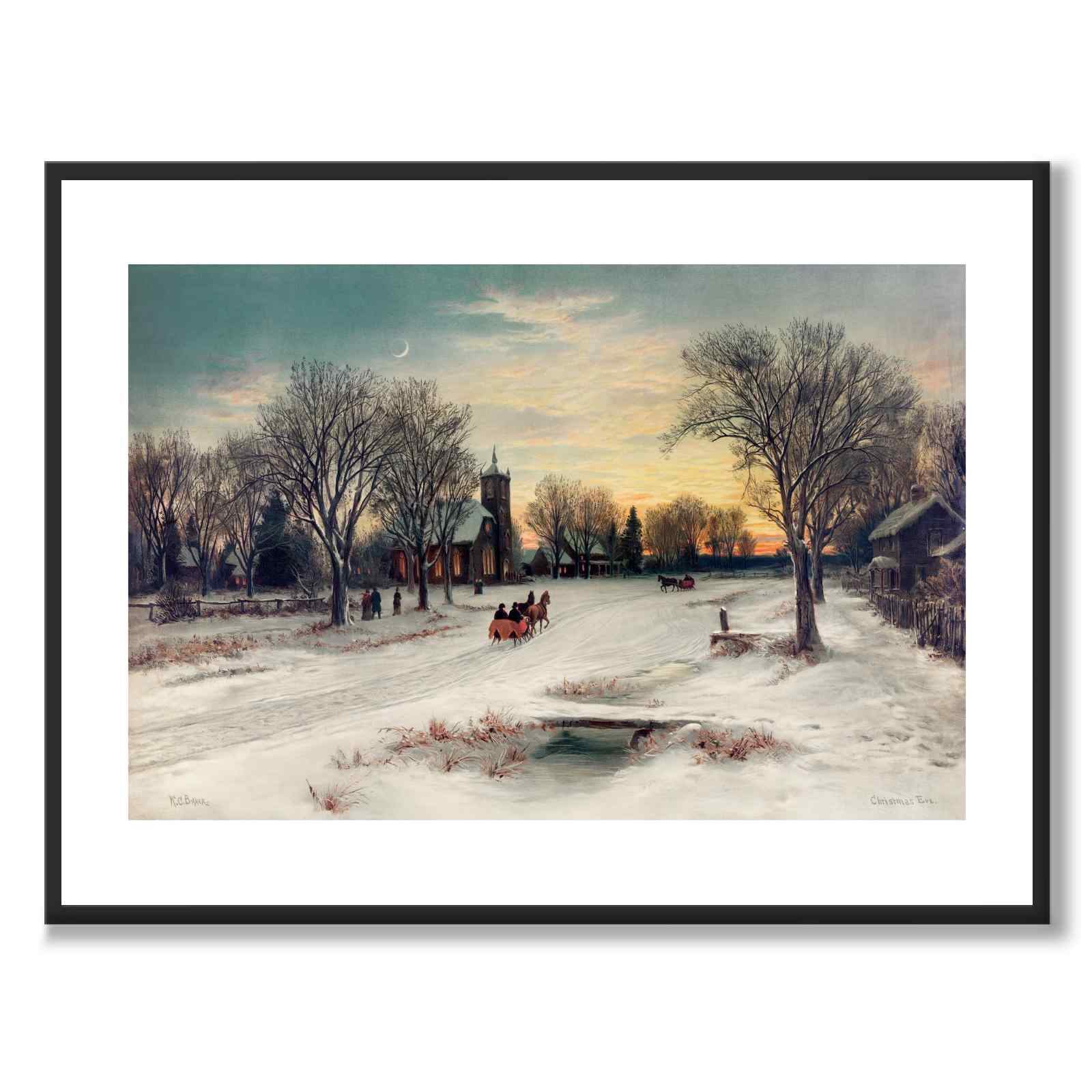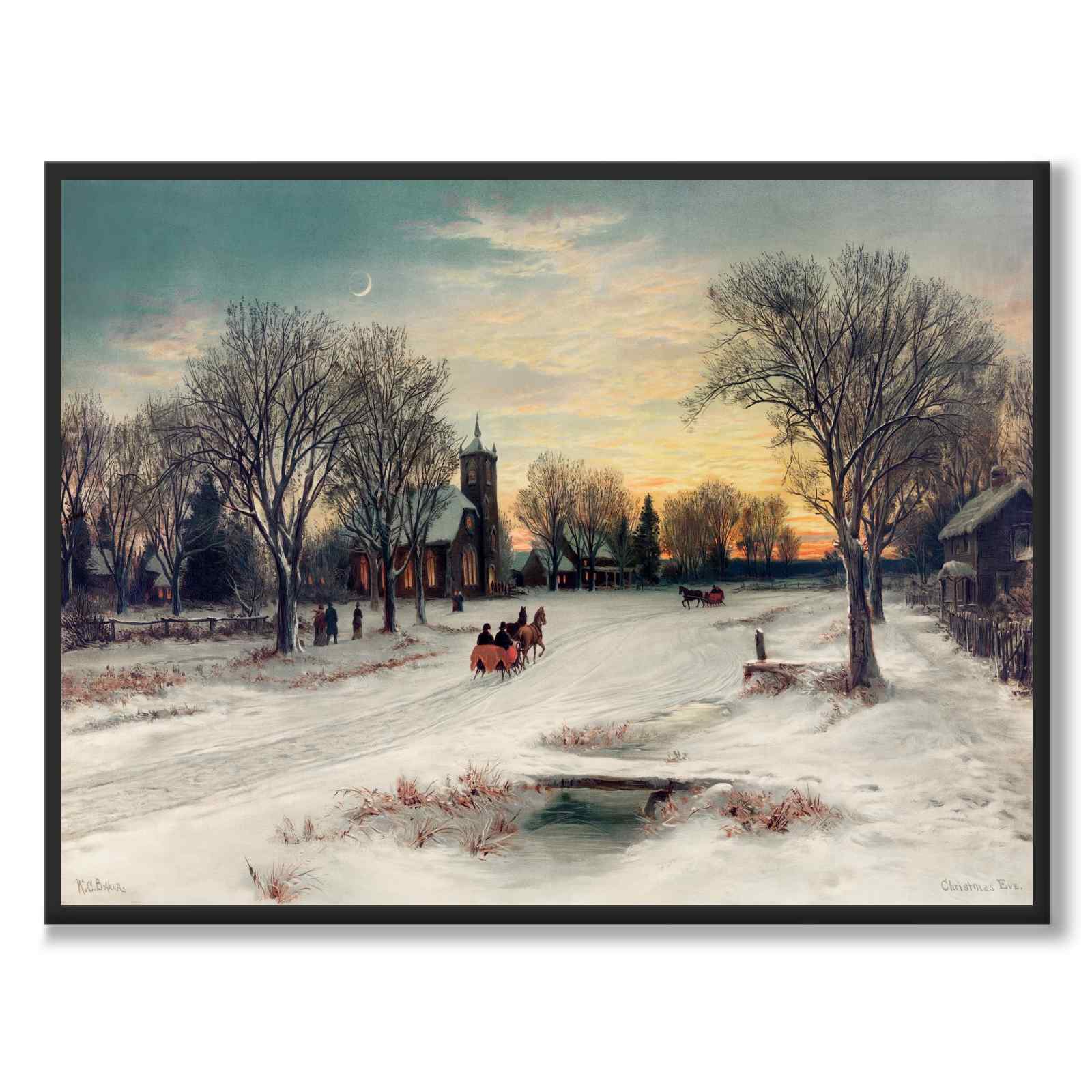 På bildet ser vi et mannskap som reiser gjennom et vakkert vinterlandskap på julaften. Månen skinner svakt på himmelen.
