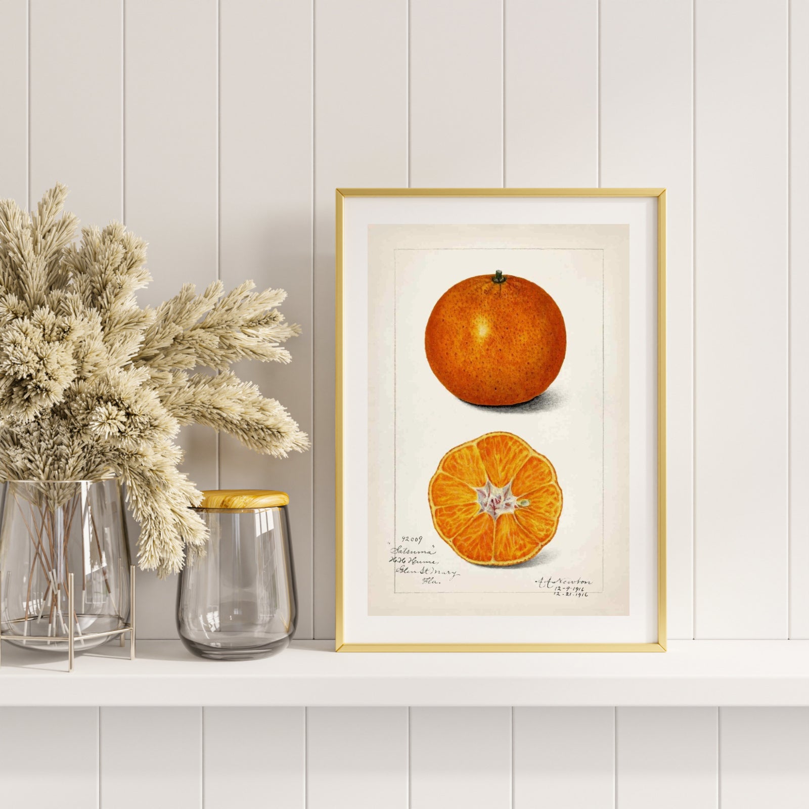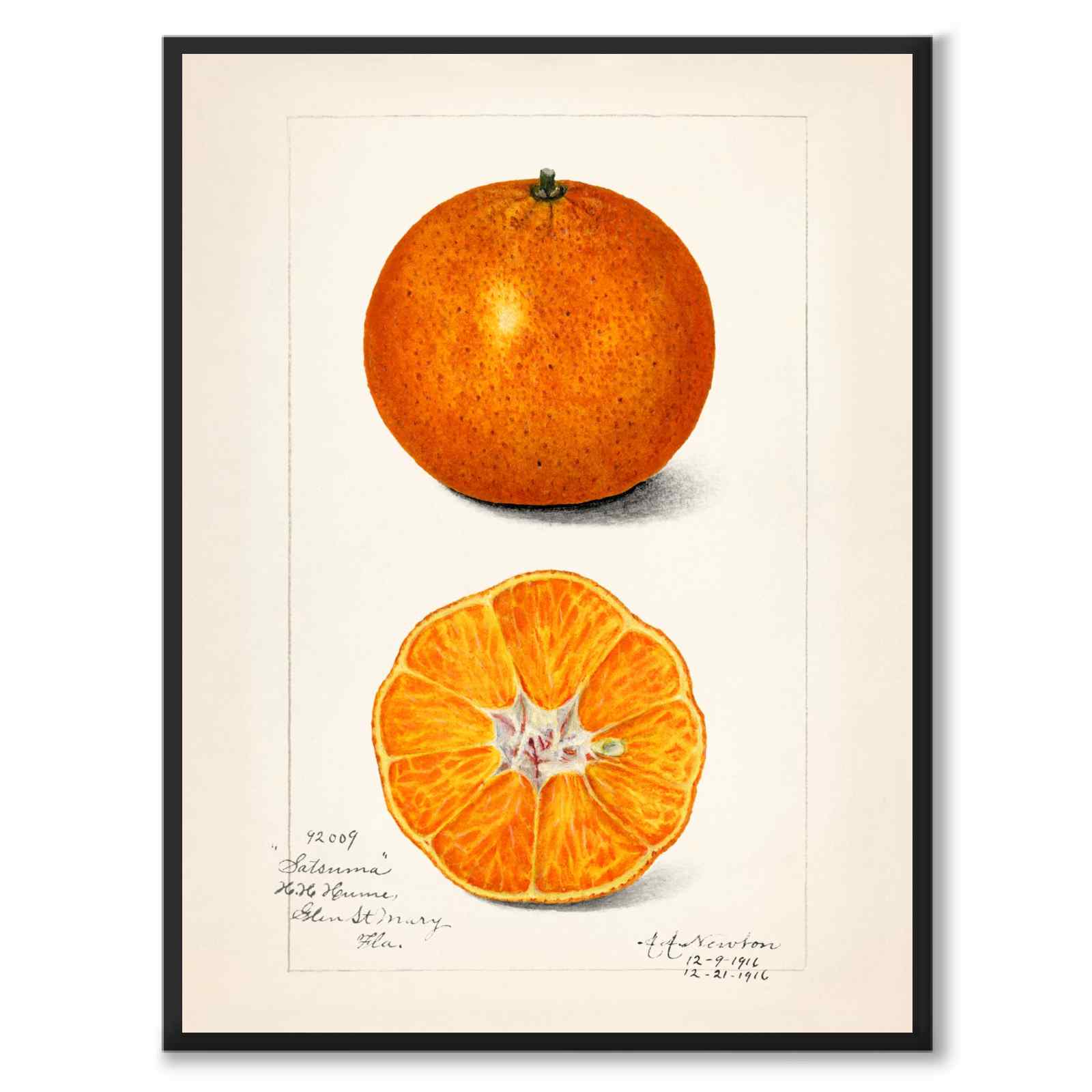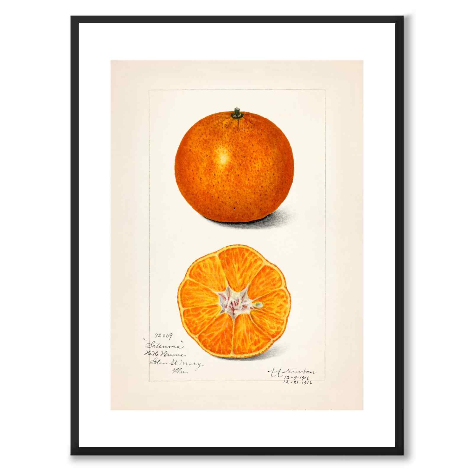 Plakat med en klassisk illustrasjon av appelsiner, på latin Citrus Sinensis , fra år 1916.