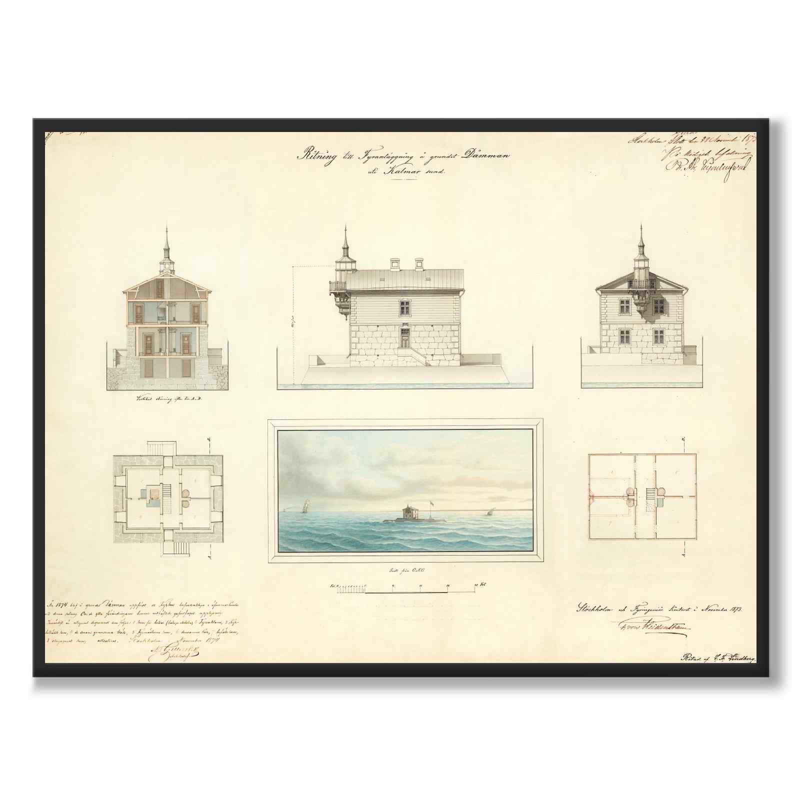 På bildet ser vi tekstene: "Tegning til fyrbygning på grunnmuren av Dammen i Kalmarsundet. Likte Stockholms slott 1873, etter allernådigste befaling, signert. Stockholm og Fyringeniørkontoret i november 1873. I 1874 ble et fyrtårn reist på fundamentet til demningen hovedsakelig i samsvar med denne tegningen."