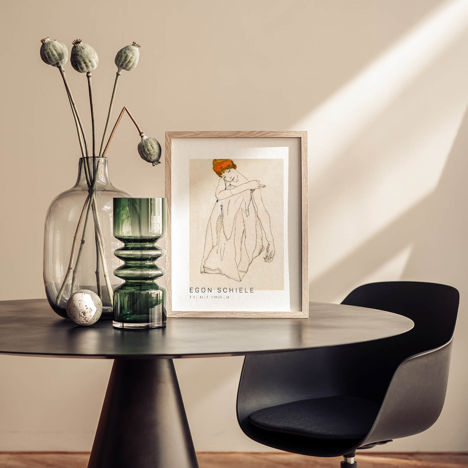 Plakat med strekillustrasjon av Egon Schiele. Motivet heter Dancer (1913) og originalen er på The MET Museum i New York.