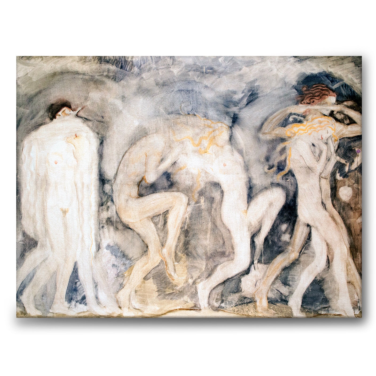 Lerret med maleriet De dansende nymfene av John Bauer fra 1915. Motivet forestiller vakre, nakne mennesker som danser fremover. Til høyre ser vi også hvite fugler og hvitspurver.