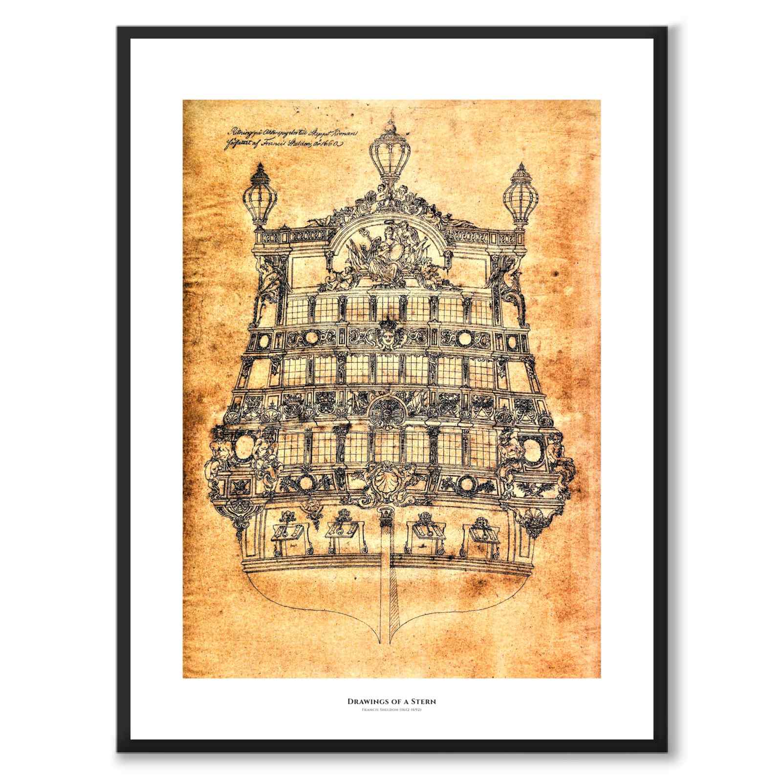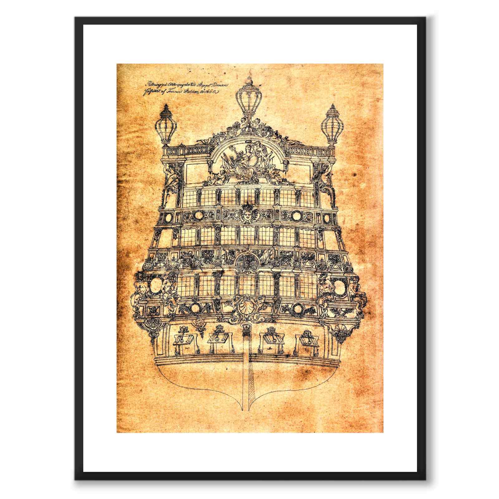 Plakat med tegning på akterspeilet til det historiske skipet Kronan skrevet av Francis Sheldon i 1660.