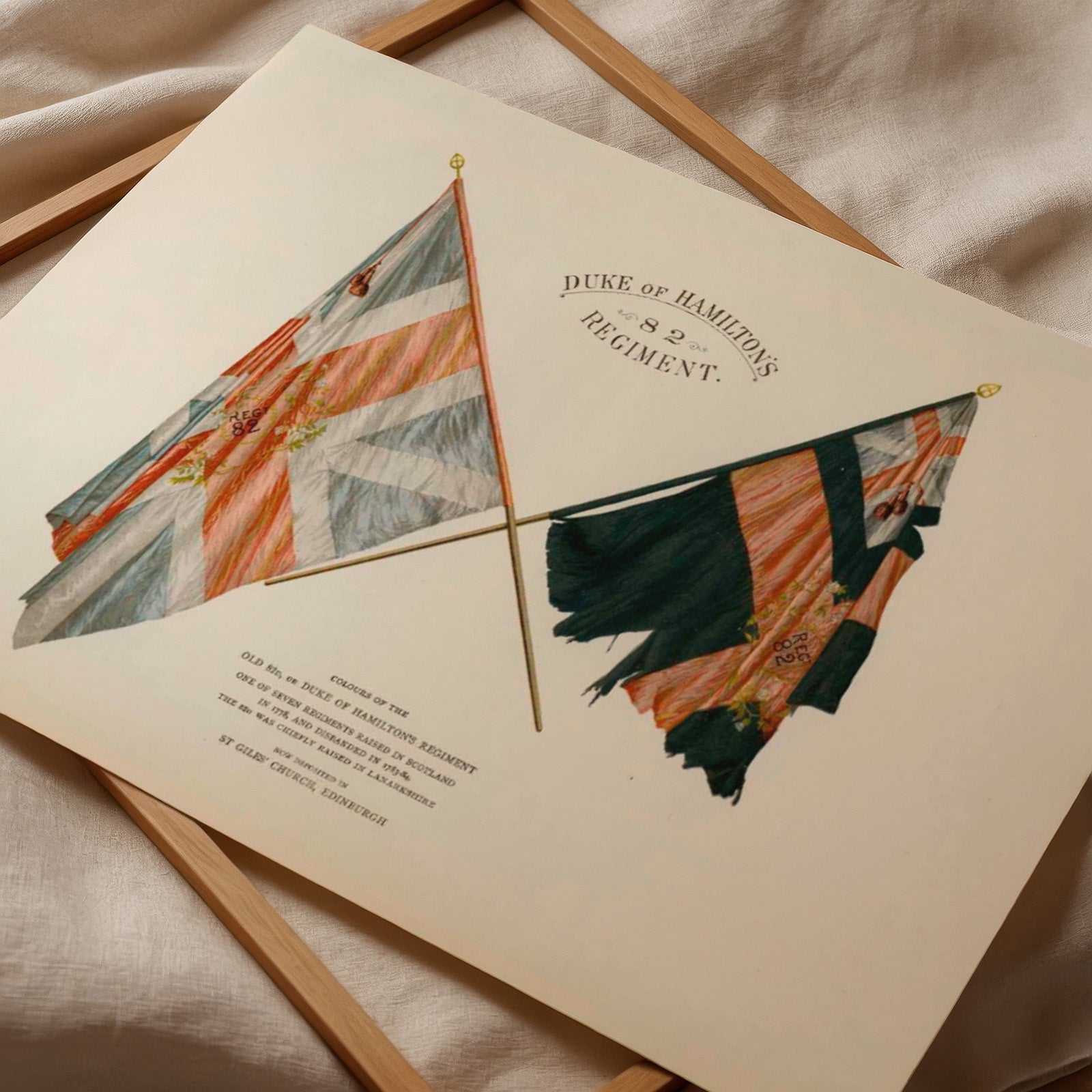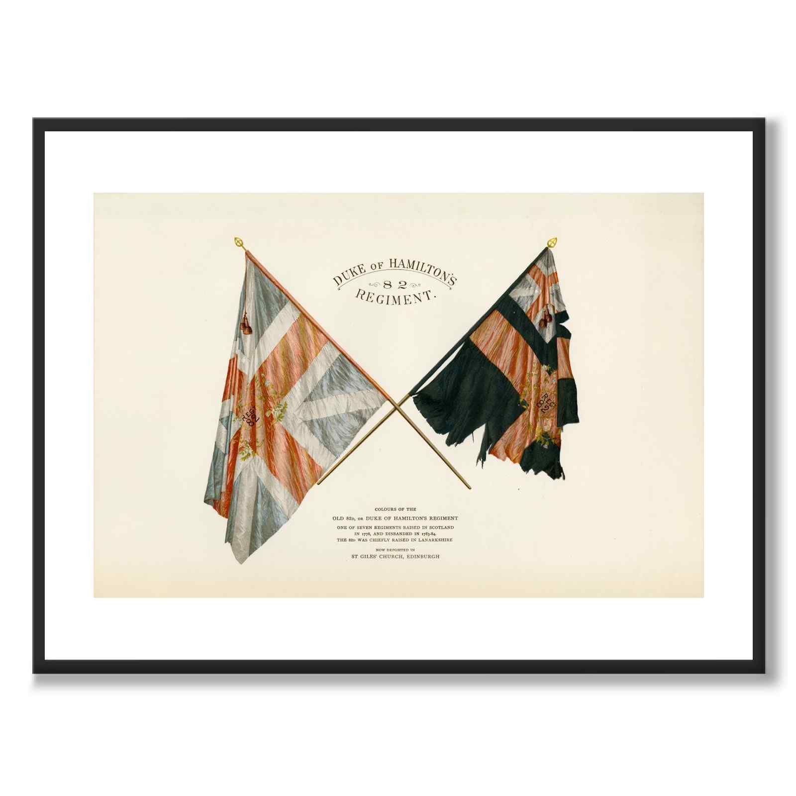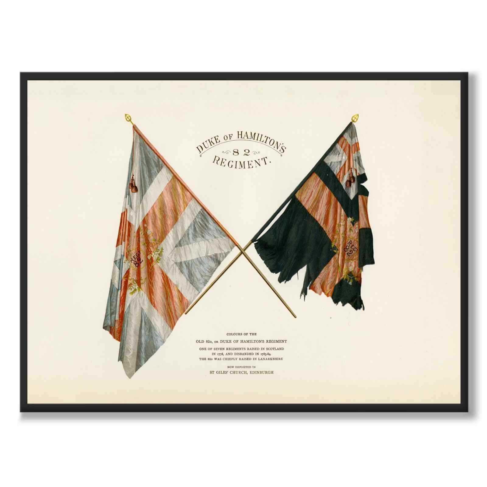 Plakat med en illustrasjon som viser flaggene til det britiske 82. regiment "Duke of Hamilton's Regiment".