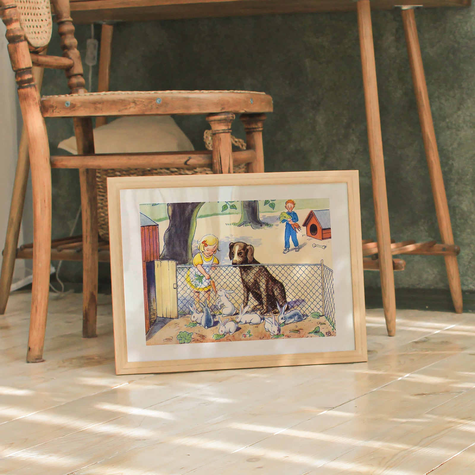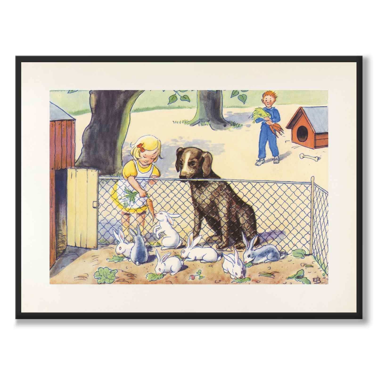 I denne illustrasjonen ser vi Annika mate flere hvite kaniner med en gulrot. Ved siden av henne sitter en brun hund og i bakgrunnen sees gutten Olle i blå klær som er på vei med flere gulrøtter.