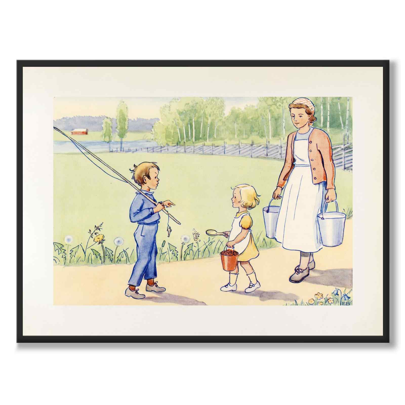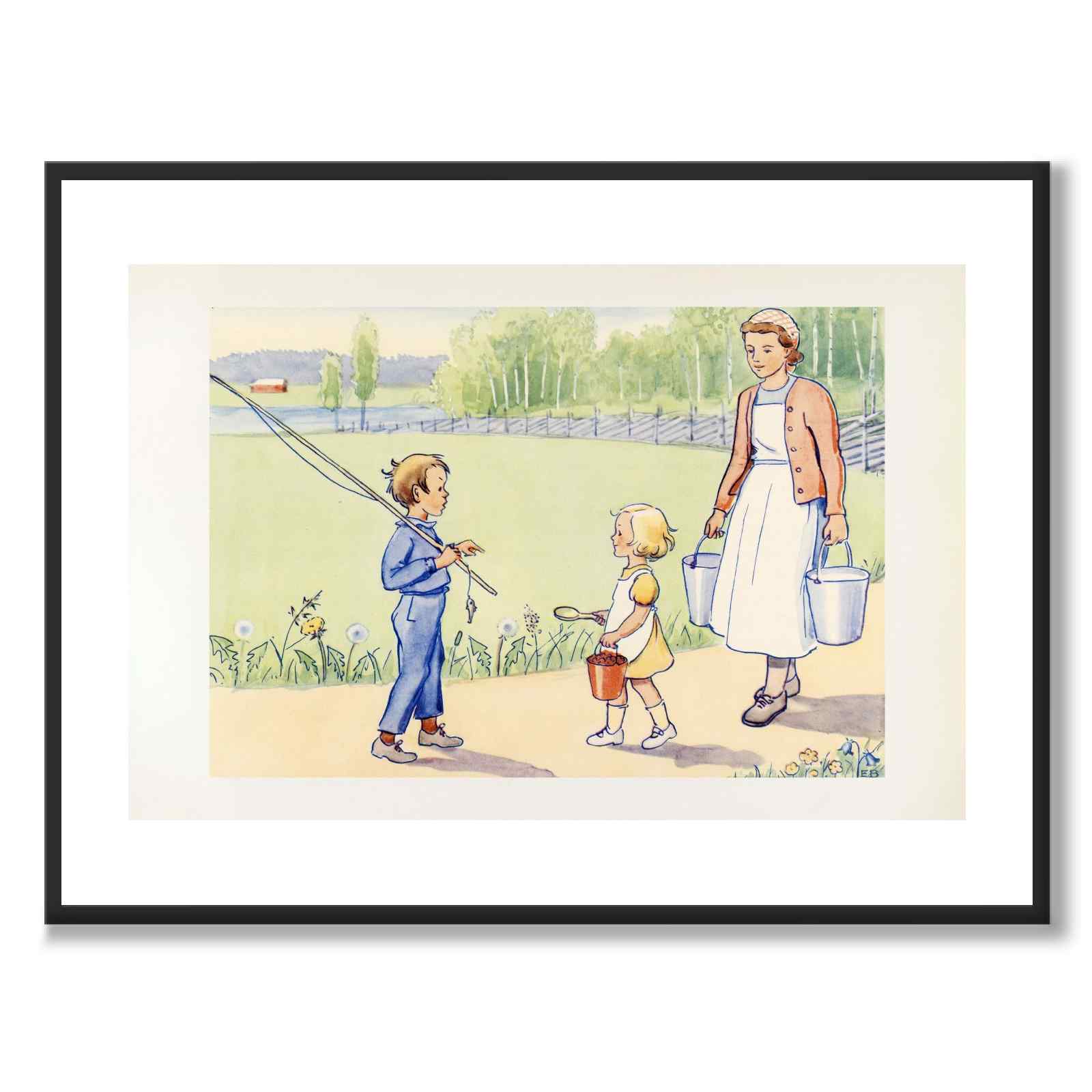 I denne illustrasjonen ser vi Annika møte Olle, gutten i blå klær. Olle står med en fiskestang og Annika holder en rød bøtte. Bak henne går en voksen kvinne som bærer to bøtter.