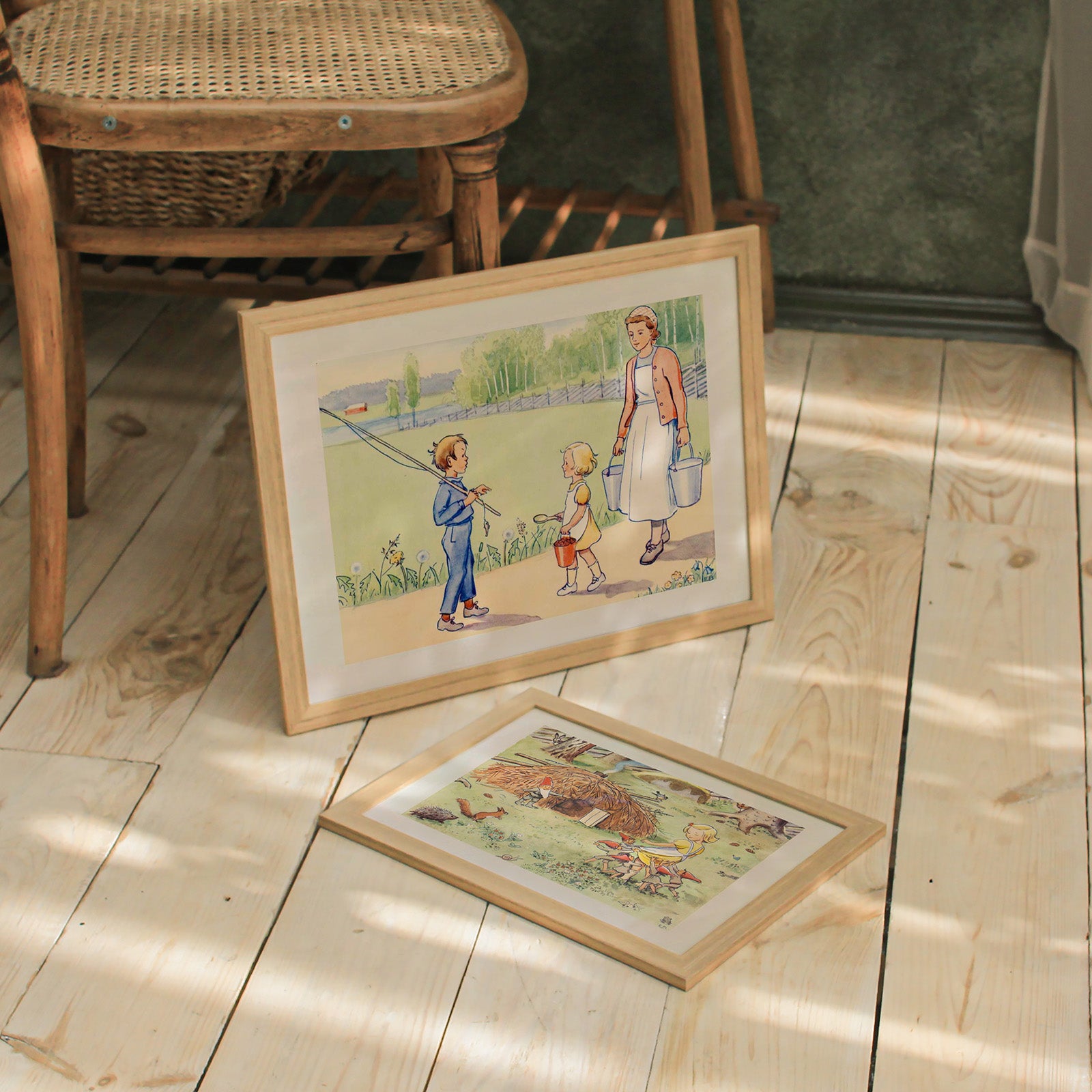 Plakat med illustrasjon fra Elsa Beskows bildebok «Duktiga Annika» som ble utgitt i 1941. Boken handler om Annika, en snill og talentfull jente som hjelper til med å passe kua Majros.
